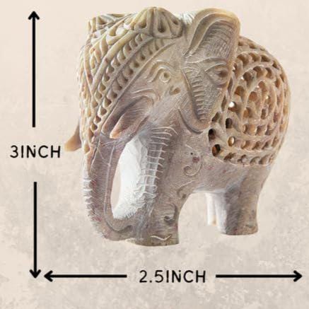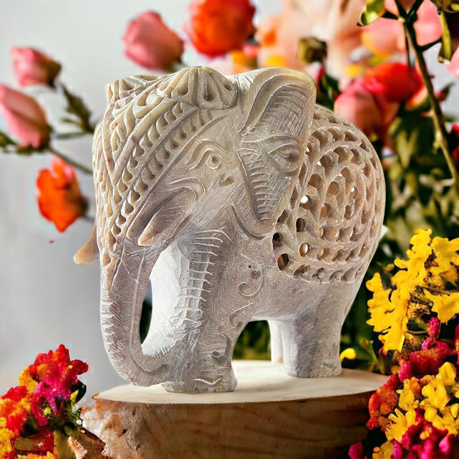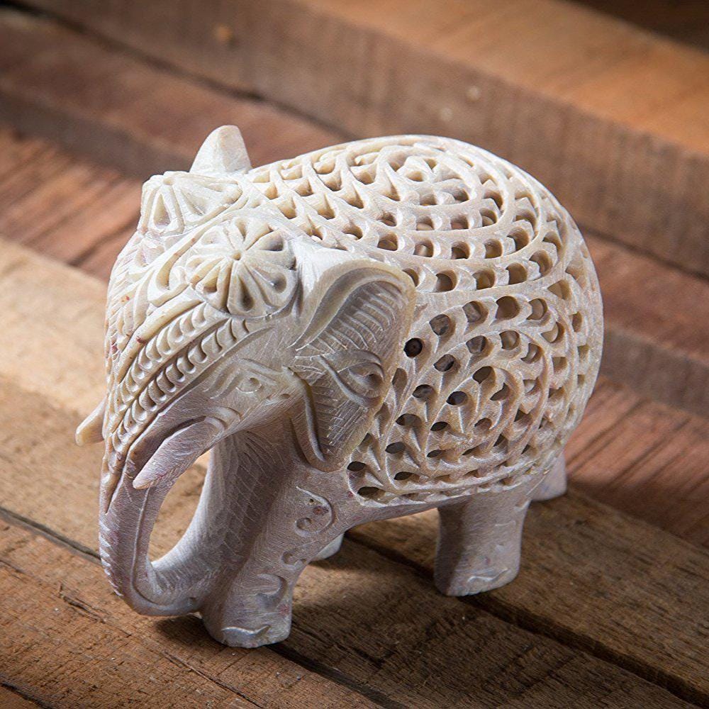 Handmade Indian Stone Elephant Figurine with Jali Openwork & Baby Elephant Inside | Traditional Soapstone Decor Gift Sculpture
