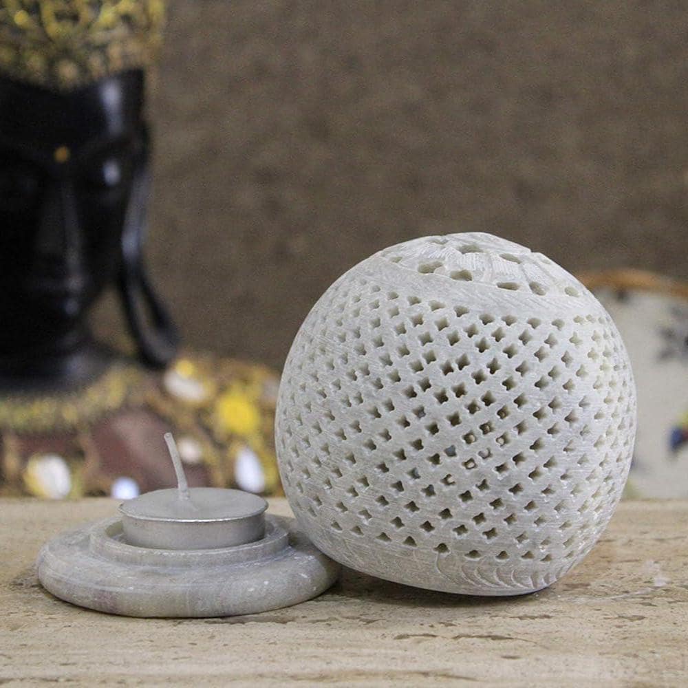 ✨ Authentic Handmade Craftsmanship Skillfully handcrafted by skilled artisans from natural marble or soapstone, this tea light holder showcases beautiful jali (openwork) lattice carving that softly diffuses candlelight, creating mesmerizing patterns and a cozy ambience — perfect for your living room, meditation corner, or dining space.