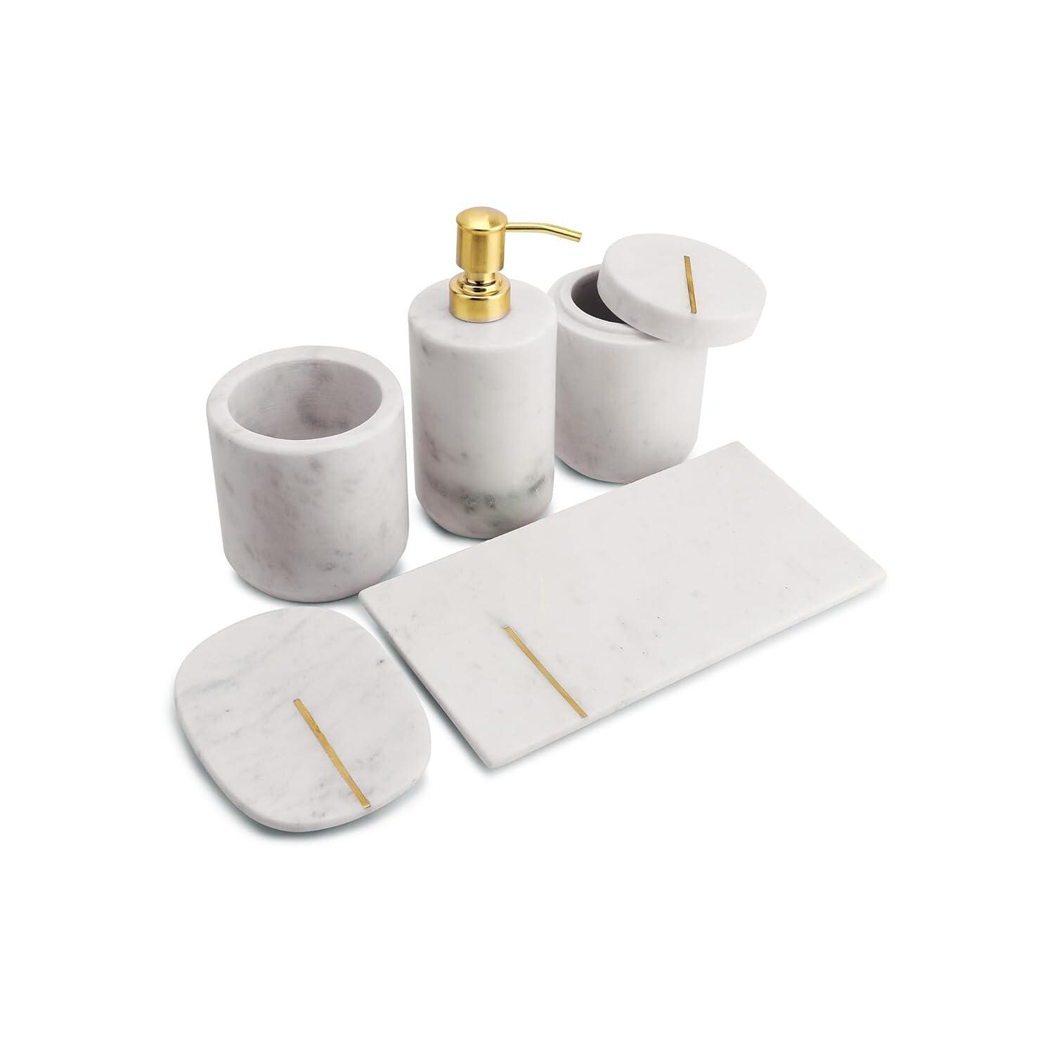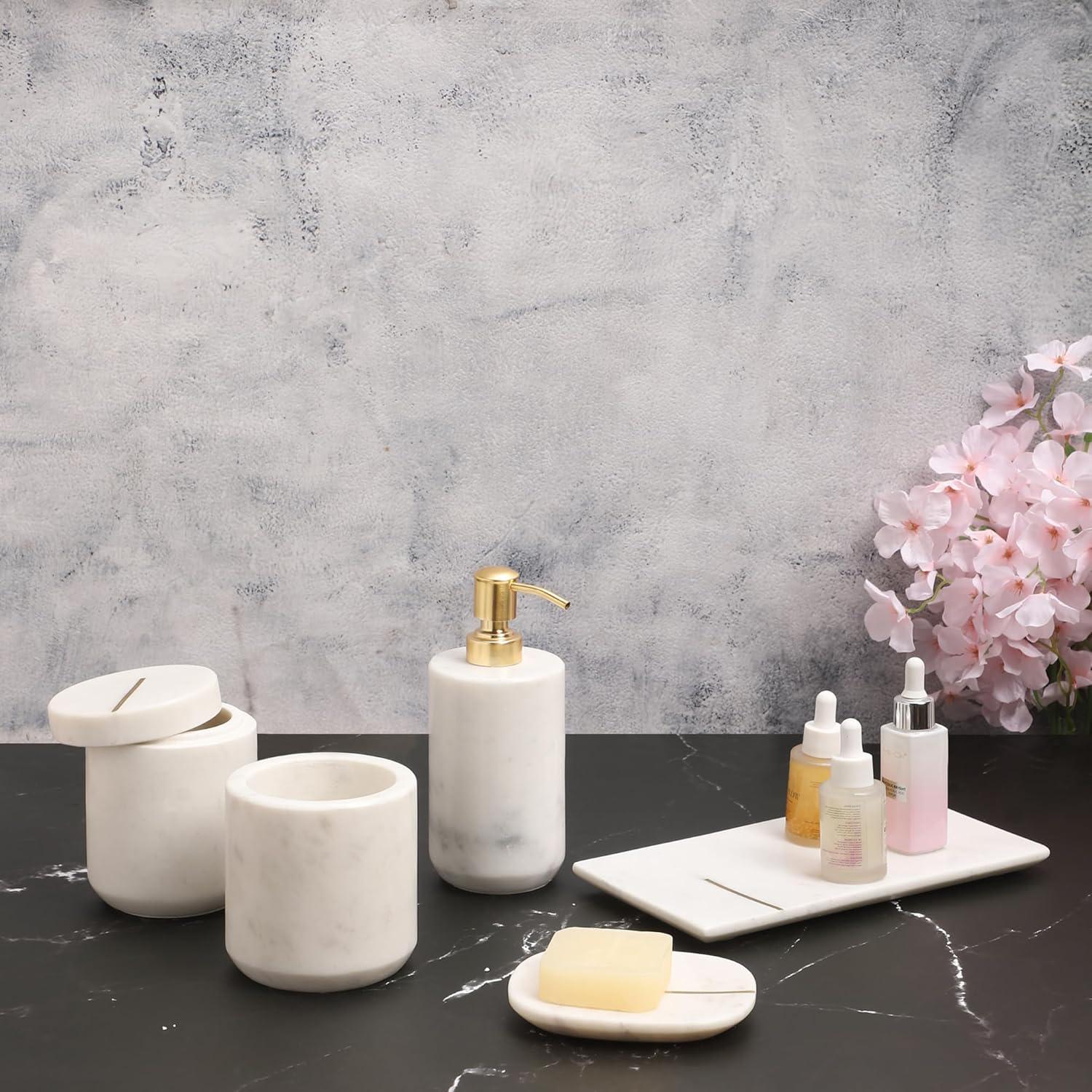 Elevate your bathroom décor with this 5-Piece Luxury Marble & Brass Bathroom Accessory Set, thoughtfully designed to blend function, elegance, and modern style. Crafted from premium natural marble with gleaming brass accents, this set brings timeless sophistication and everyday practicality to your vanity or countertop.