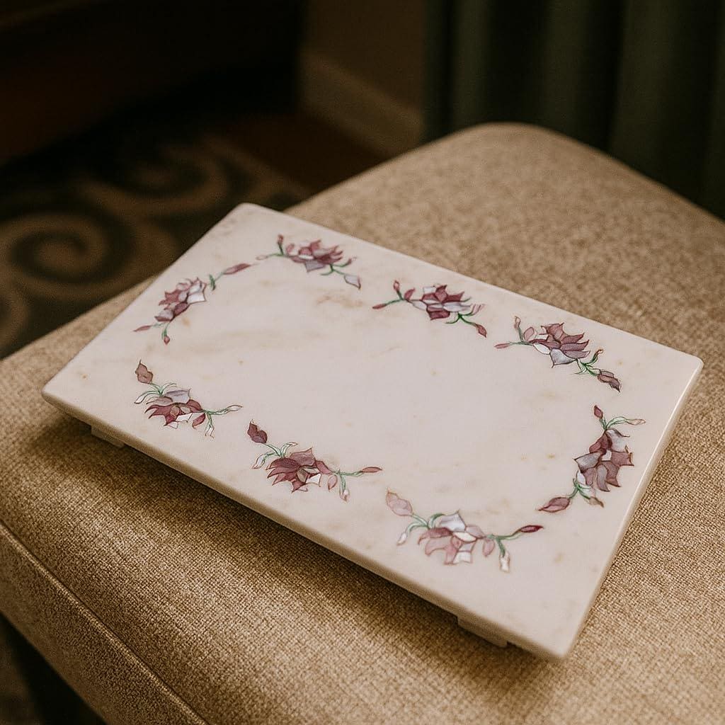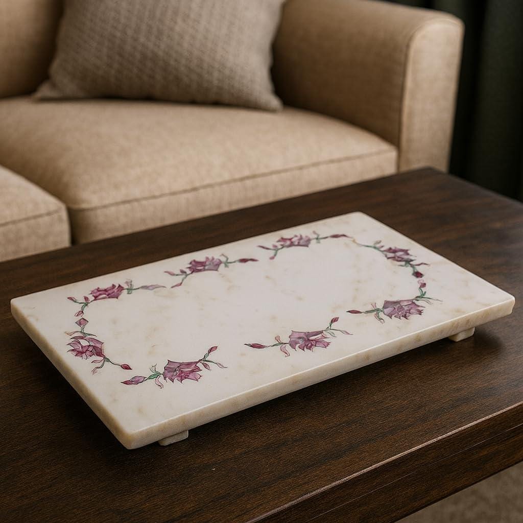 Handcrafted White Marble Serving Tray with Floral Inlay – Elegant, Functional & Decorative