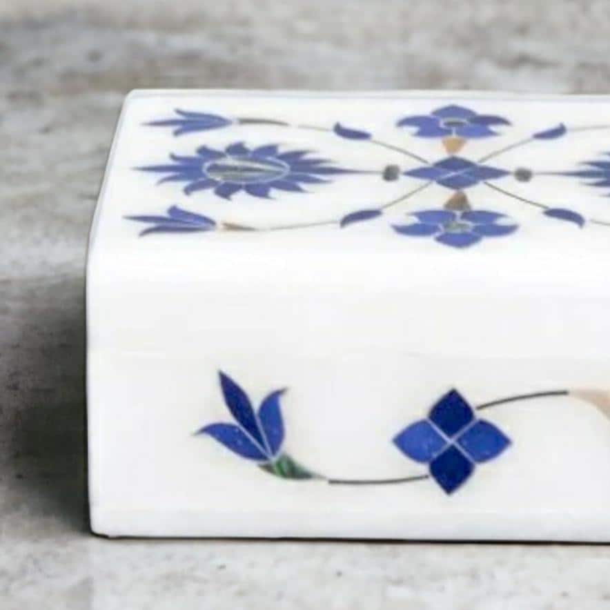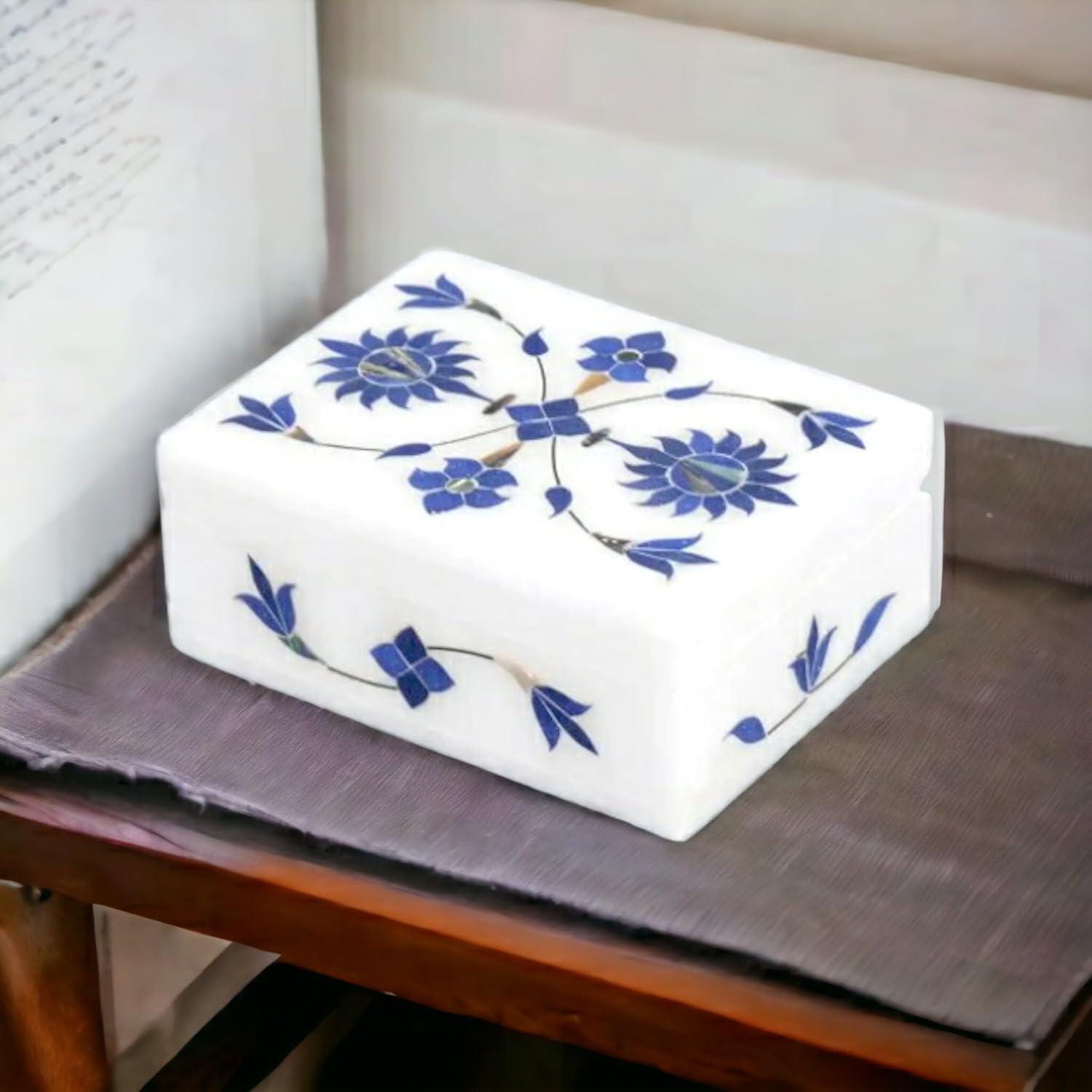 Crafted from premium white marble and adorned with a delicate blue inlay design, this compact box (approx. 4 × 3 × 1.5 inches) offers an elegant storage solution for rings, earrings, bracelets, cufflinks, and keepsakes. Its refined finish and handcrafted aesthetic make it a striking decorative piece on any dressing table, vanity, or shelf.
