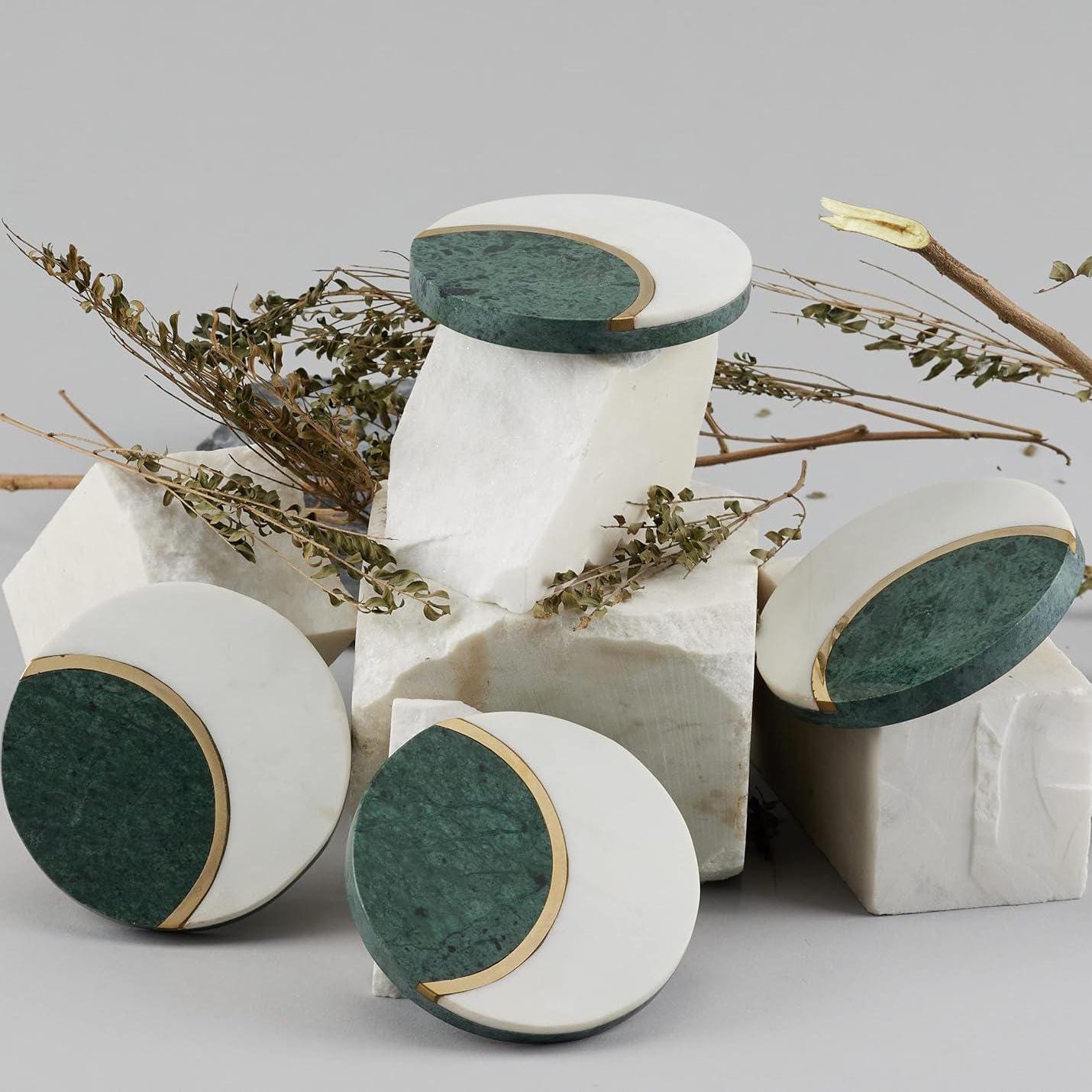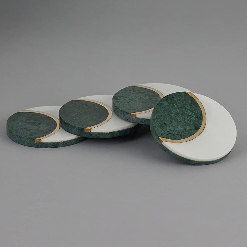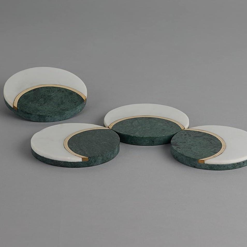 legant White & Green Marble Coasters with Brass Inlay – Set of 4