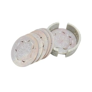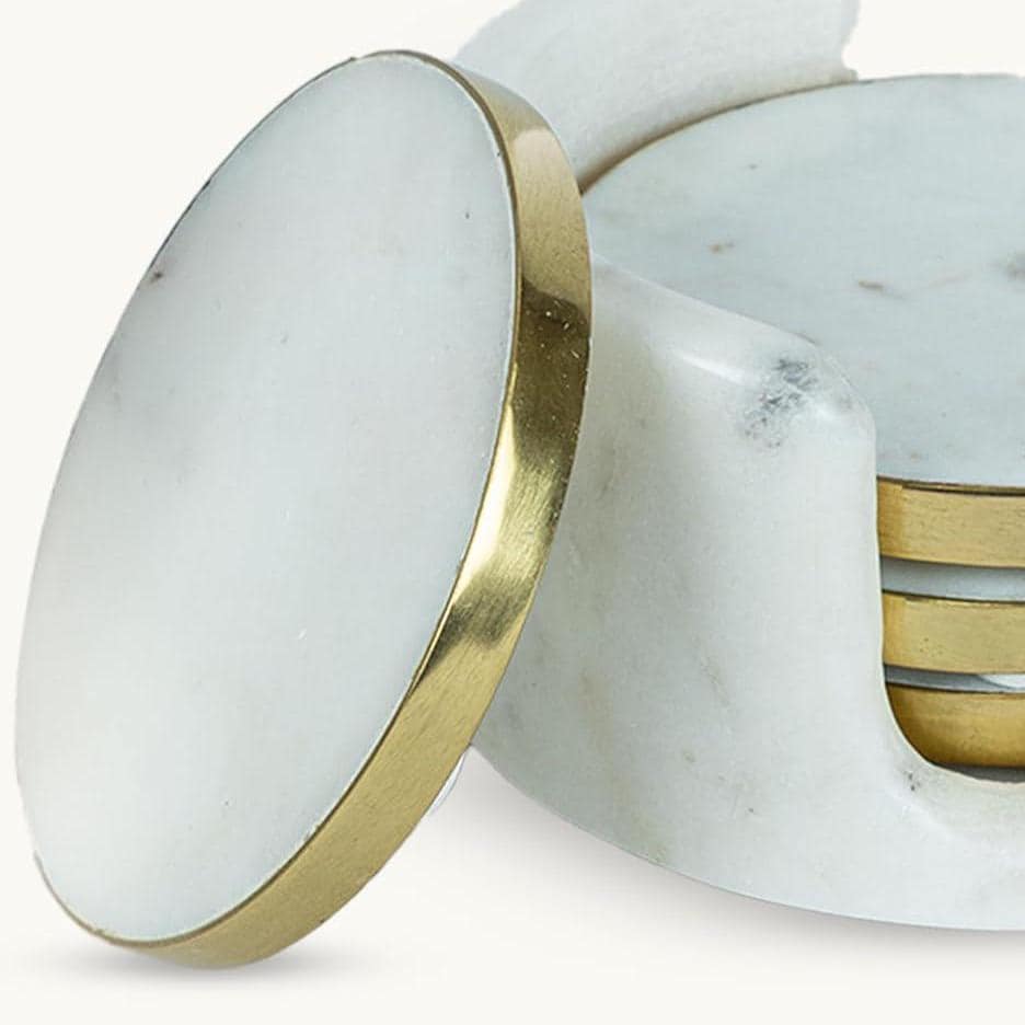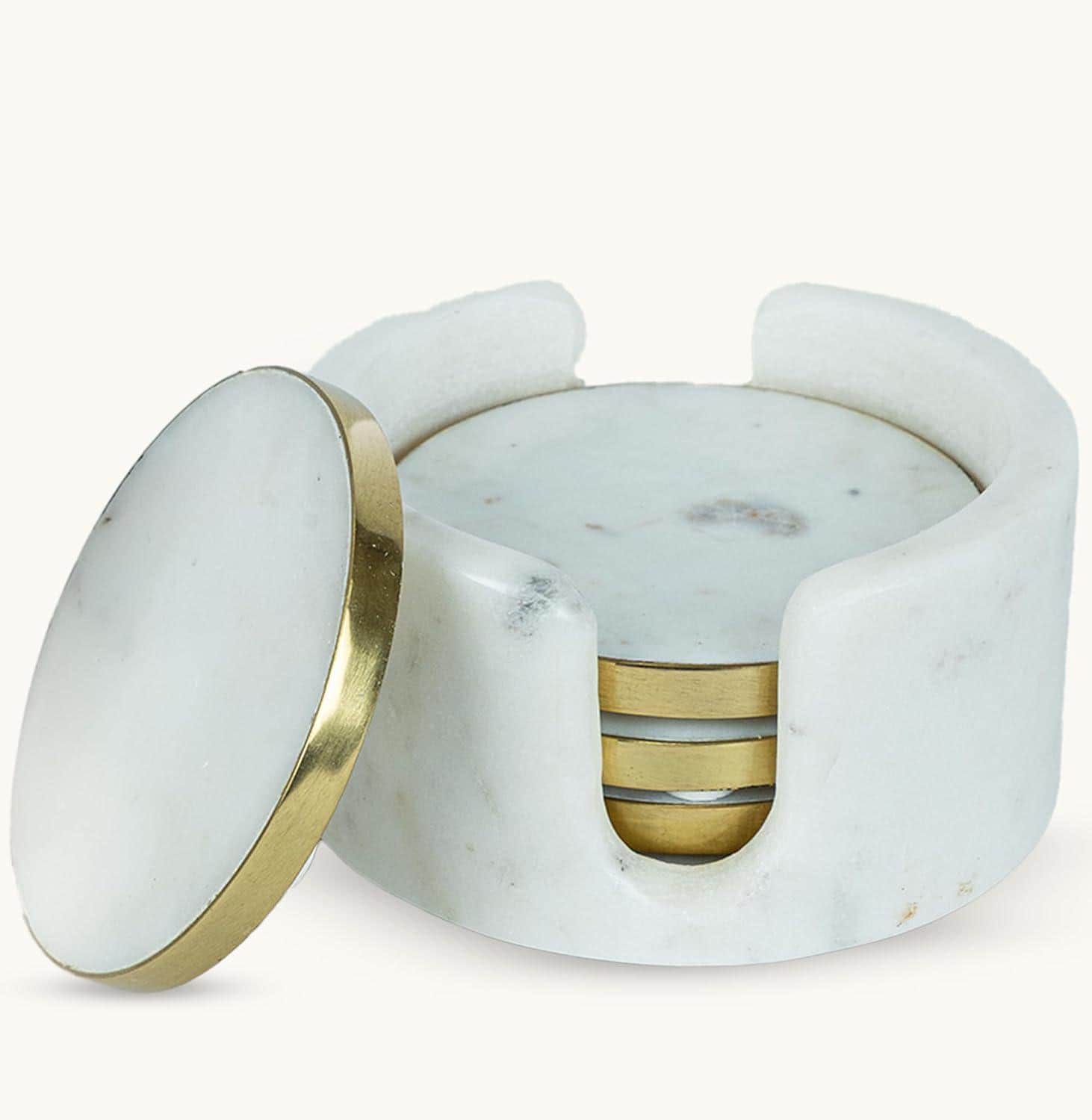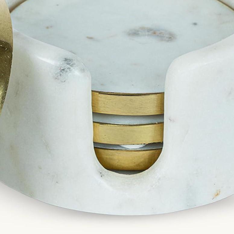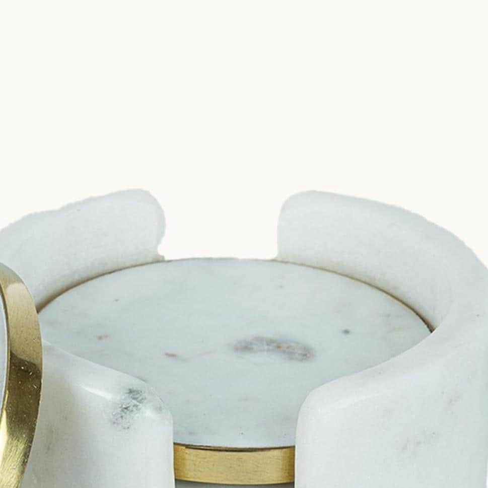 Elevate your tabletops with this White Marble Coasters Set of 4 with Holder, featuring a refined gold brass rim and thoughtful design for everyday use. These 4″ round drink coasters are both functional and stylish — ideal for coffee, tea, cocktails, and all your favourite beverages.