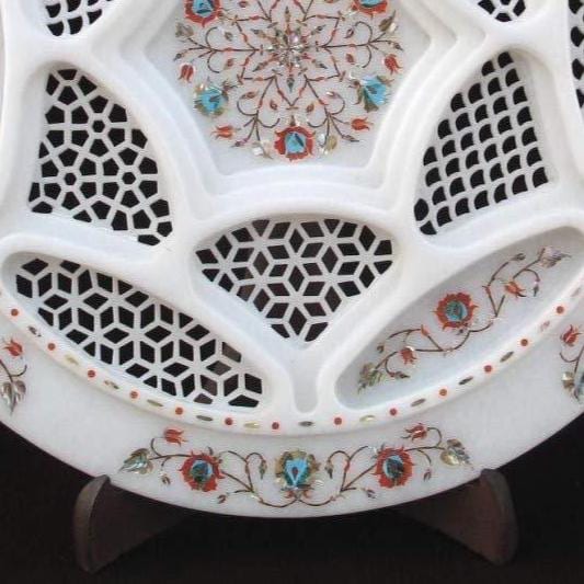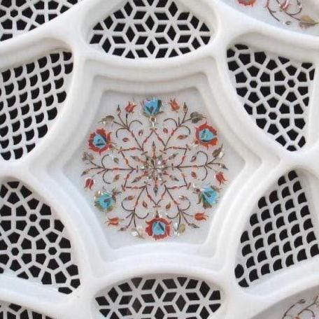 ✨ Product Highlights: • Premium Marble Quality: Made from authentic Rameshwaram marble, known for its natural beauty and durability — each piece has unique veining and subtle stone character making it one‑of‑a‑kind. • Handcrafted Inlay Design: Skilled artisans create detailed marble inlay that catches the eye and reflects heritage artistry rooted in Indian marble craftsmanship. • Perfect Size & Versatility: At 12″ (30 cm) diameter, it’s ideal as a center table decor, entryway accent, or as an elegant focal point on shelves, console tables, or mantelpieces. • Multi‑Functional Décor: Use as a decorative catch‑all tray, candle display base, or floating floral centerpiece — perfect for home staging or seasonal styling. • Thoughtful Gift Item: A luxurious and unique present for housewarmings, weddings, anniversaries, festive celebrations, and curated artisan gift boxes.