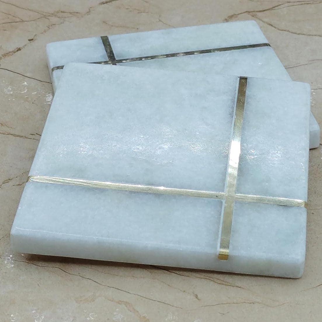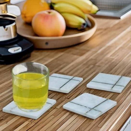 Designed to protect your furniture from moisture rings, condensation, and heat marks, this set of four square coasters is ideal for tea mugs, coffee cups, wine glasses, cocktails, and everyday drinkware. The brass detailing paired with smooth, high-quality marble makes this set a standout accessory on dining tables, coffee tables, bars, and kitchen counters.