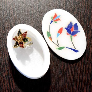 Whether placed in a bedroom, living room, or entryway, this marble inlay box enhances both modern and traditional interiors with its classic charm and polished stone finish.