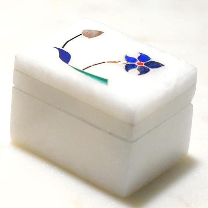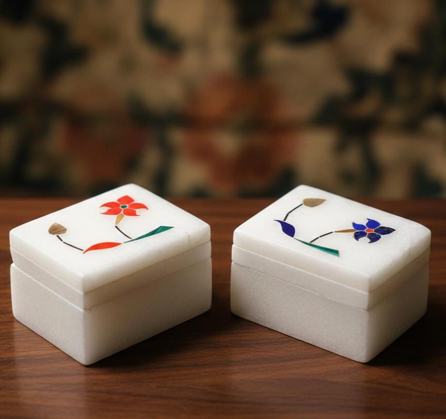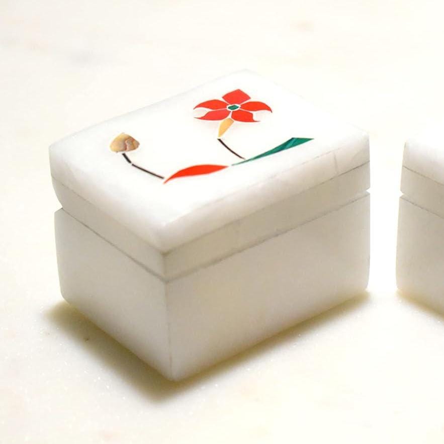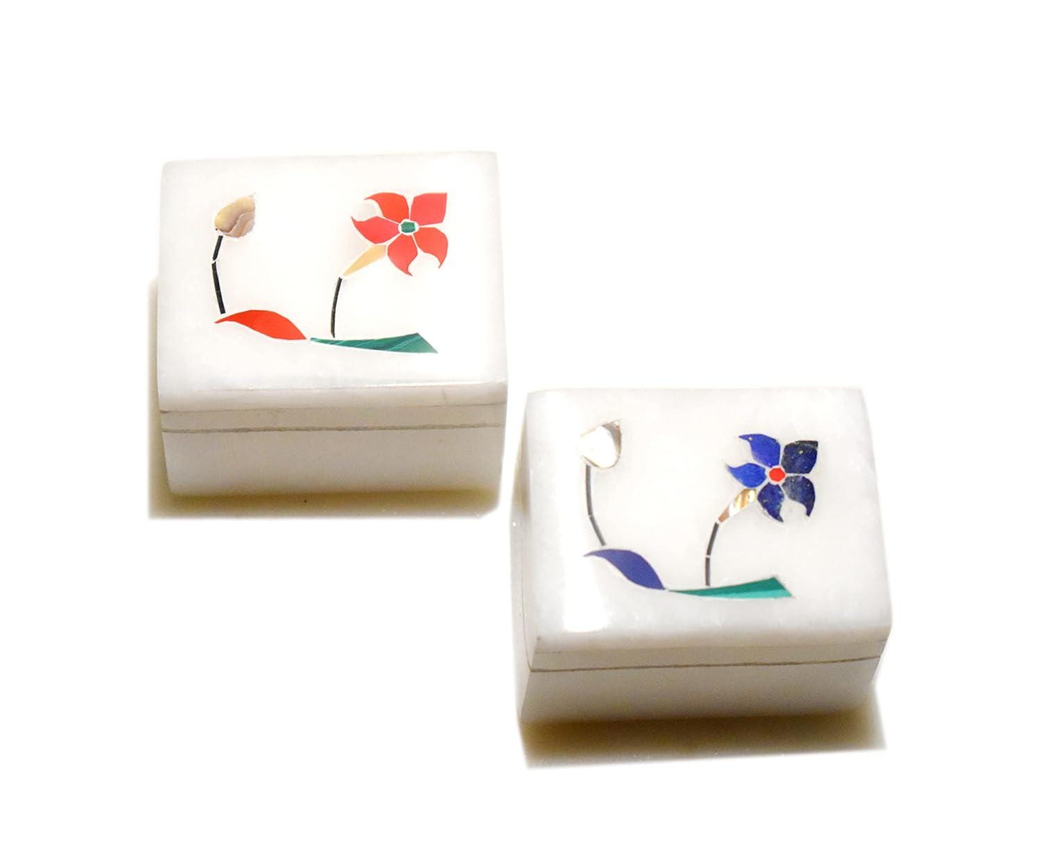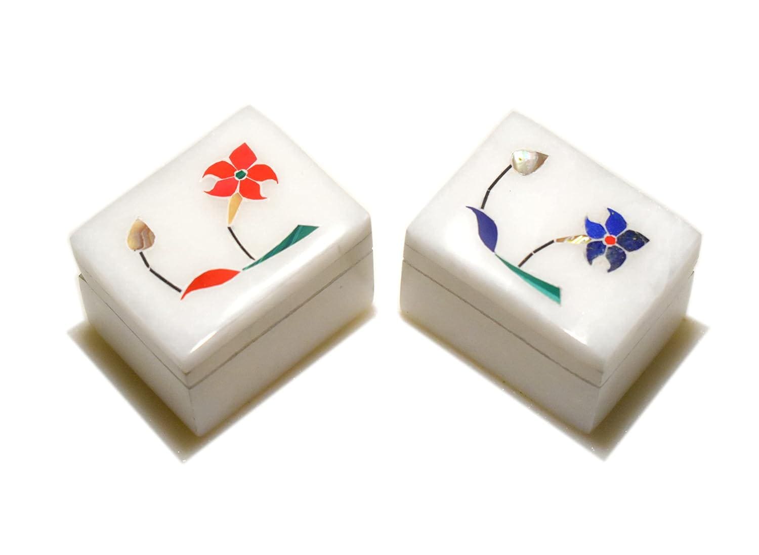 Each set includes two compact marble boxes (approx. 2″ × 1.5″) made from premium white marble with polished surfaces and delicate floral inlay details. The natural marble gives a luxurious, solid feel while showcasing unique vein patterns — no two pieces are exactly alike.
