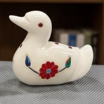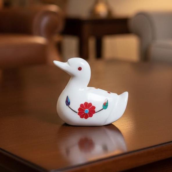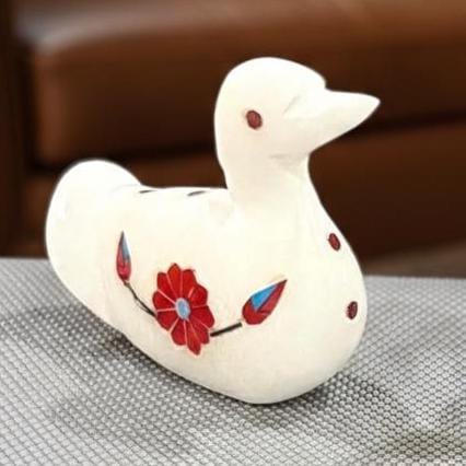 Each duck figurine is individually handcrafted by skilled artisans using traditional stone-carving techniques. The smooth marble surface is enhanced with vibrant red gemstone inlay, creating a refined contrast that adds luxury and visual appeal. Due to the handmade nature, every piece is unique, showcasing slight variations that enhance its authentic character.
