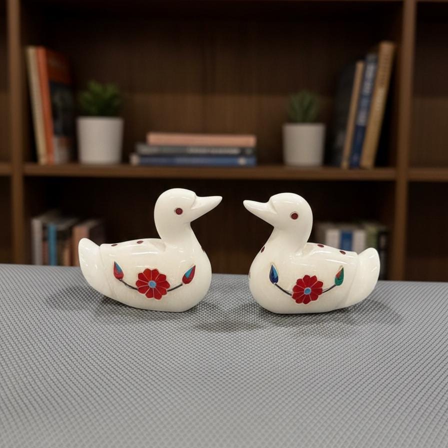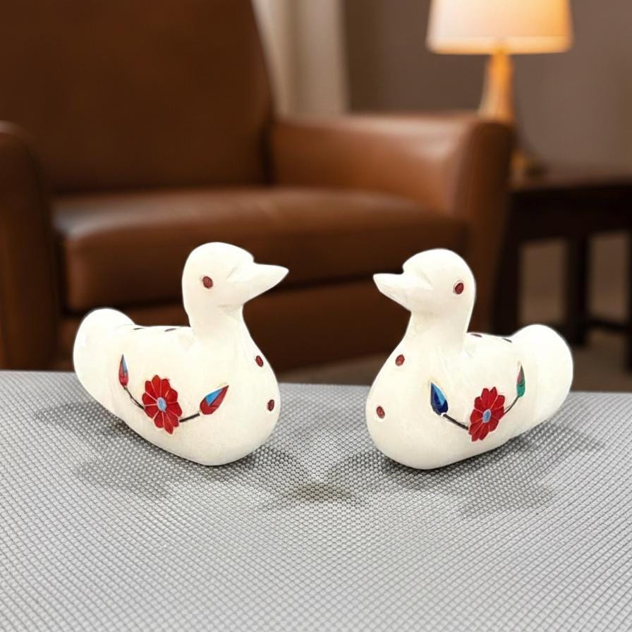 Bring elegance, symbolism, and artisanal charm into your space with this Handcrafted Marble Duck Figurines Set of 2, beautifully adorned with red gemstone inlay work. Carefully carved from premium natural marble, these decorative duck statues reflect timeless craftsmanship and cultural artistry, making them a standout addition to any home or office décor.