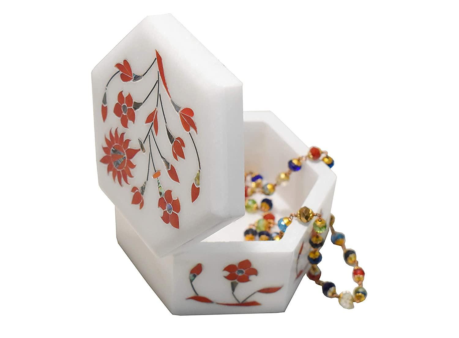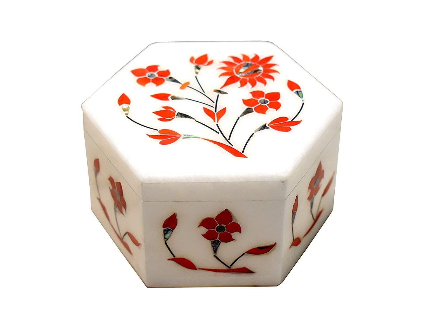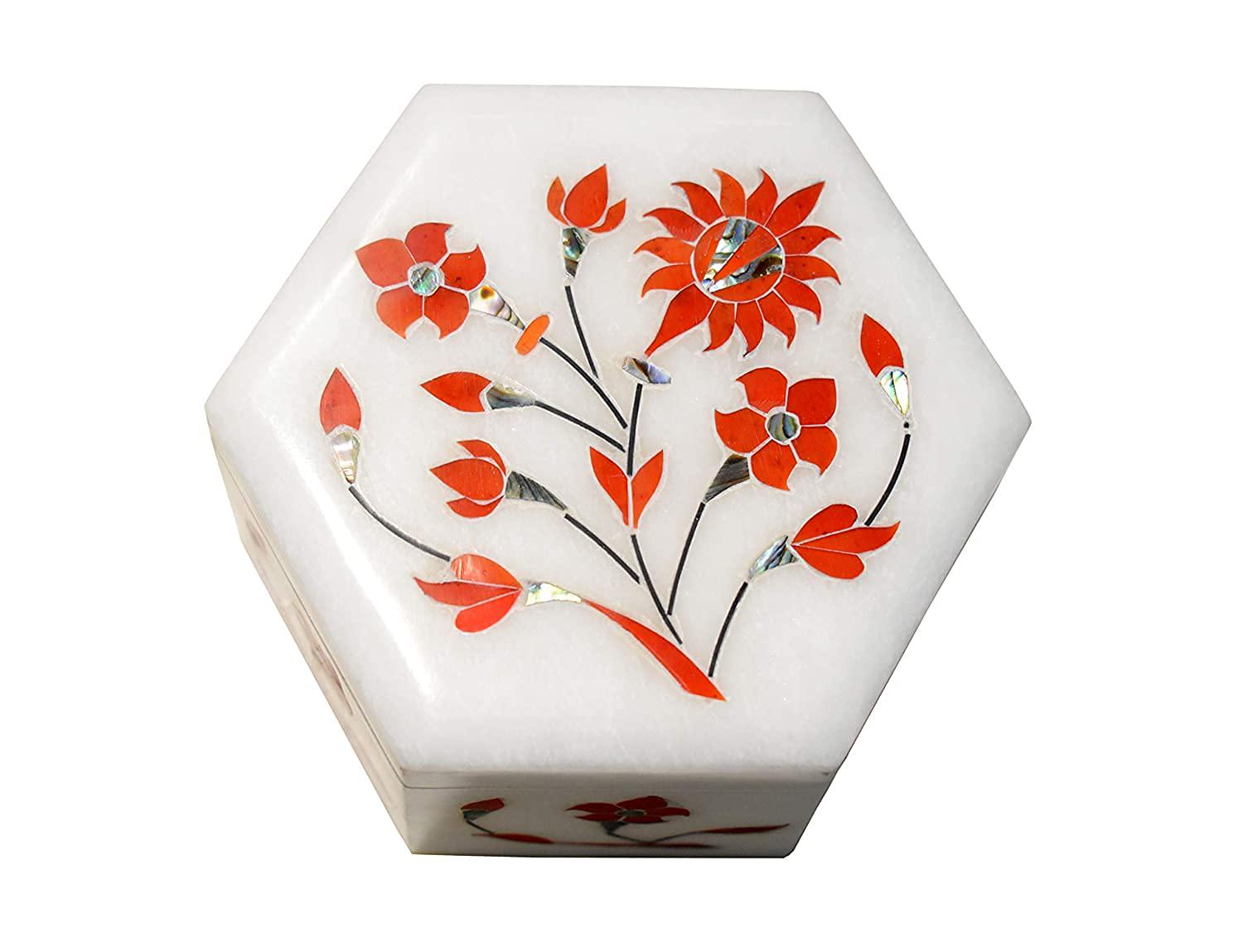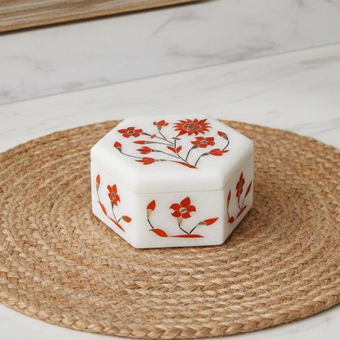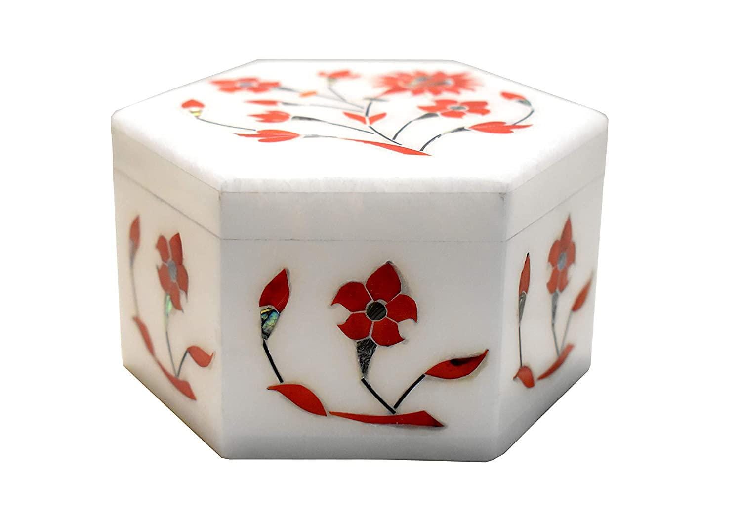 Unique Handmade Design: Featuring a hexagonal shape with intricate flower inlay, this jewellery box combines traditional Indian craftsmanship with contemporary aesthetics. Its neutral white marble and vibrant red accents make it an eye‑catching décor element for any room.