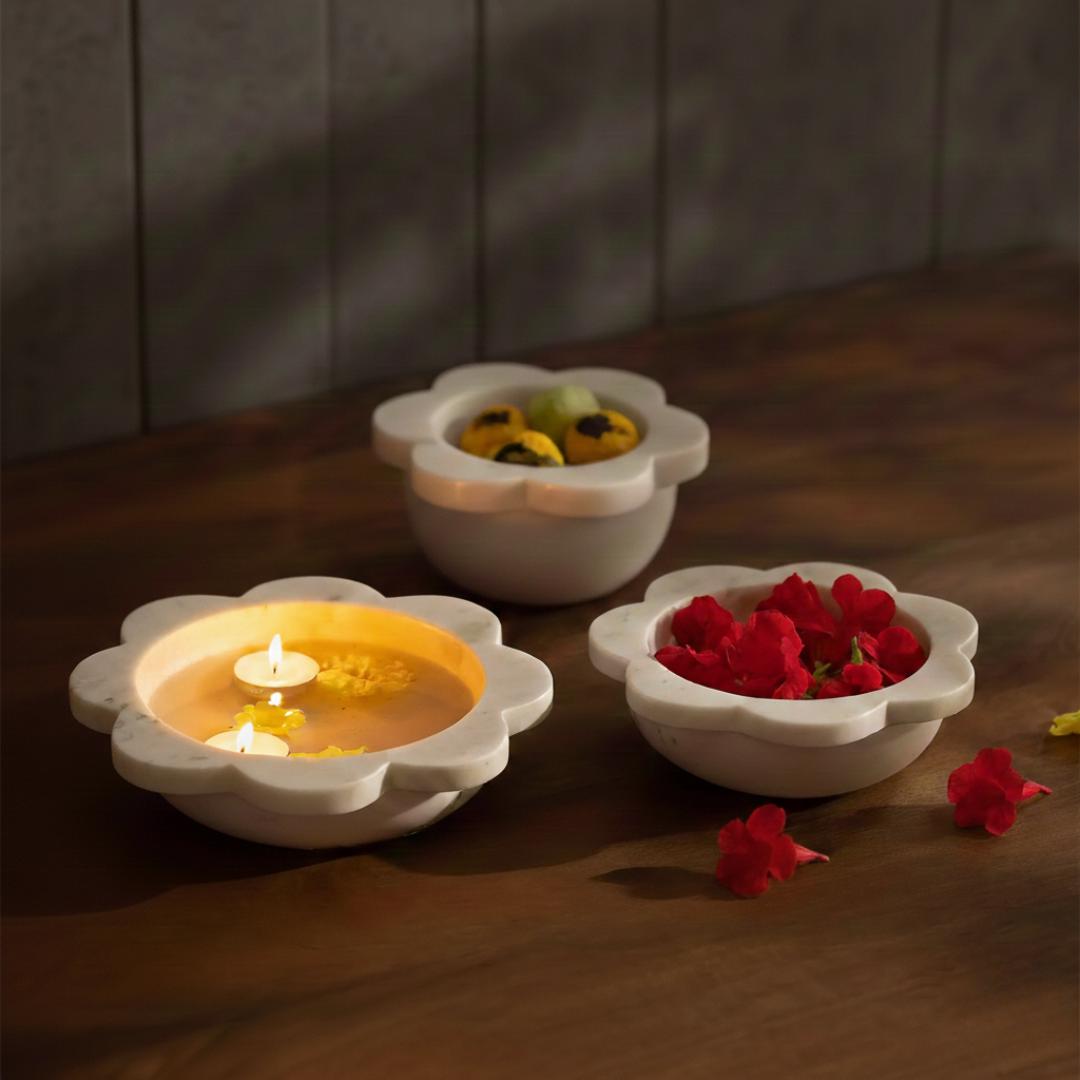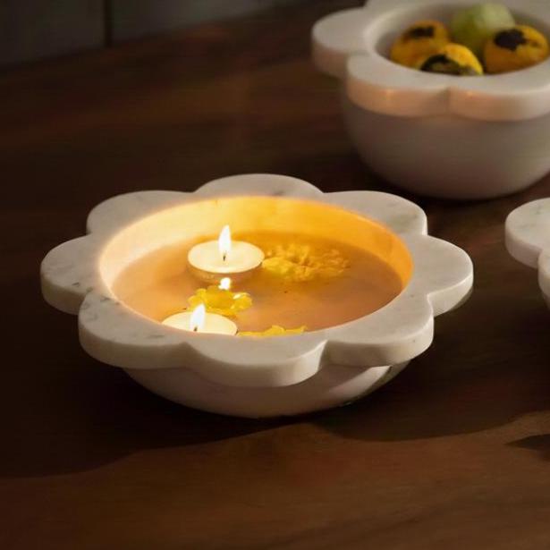 🌿 Features & Benefits • Artisan Made & Unique: Each piece is handcrafted, ensuring a one-of-a-kind look with subtle natural variations that add charm to your decor. • Premium Marble Material: Durable and elegant white marble gives this urli a refined and luxurious appearance. • Decorative Versatility: Ideal for tabletops, coffee tables, entryway consoles, altars, and festive displays — use it with water and petals for a classic floral float centerpiece or with candles for a soft, ambient glow. • Perfect Gift: A thoughtful gift for weddings, housewarmings, anniversaries, Diwali, and other celebrations. Loved for its versatility and aesthetic appeal.