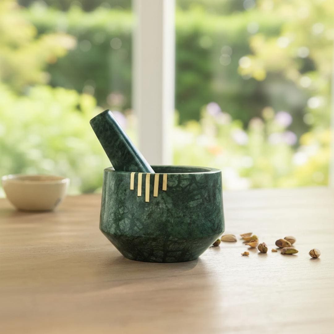 • Artisan Craftsmanship: Each mortar and pestle is handcrafted, making every piece unique with natural stone veining and subtle color variation. • Quality Green Marble: Solid marble construction ensures lasting strength and an elevated kitchen accessory. • Brass Inlay Detail: Decorative brass accents add a touch of luxury and make this set a stand-out on display or for entertaining. • Versatile Kitchen Use: Ideal for crushing spices, grinding herbs, making pastes, chutneys, pestos, and fresh seasoning blends.