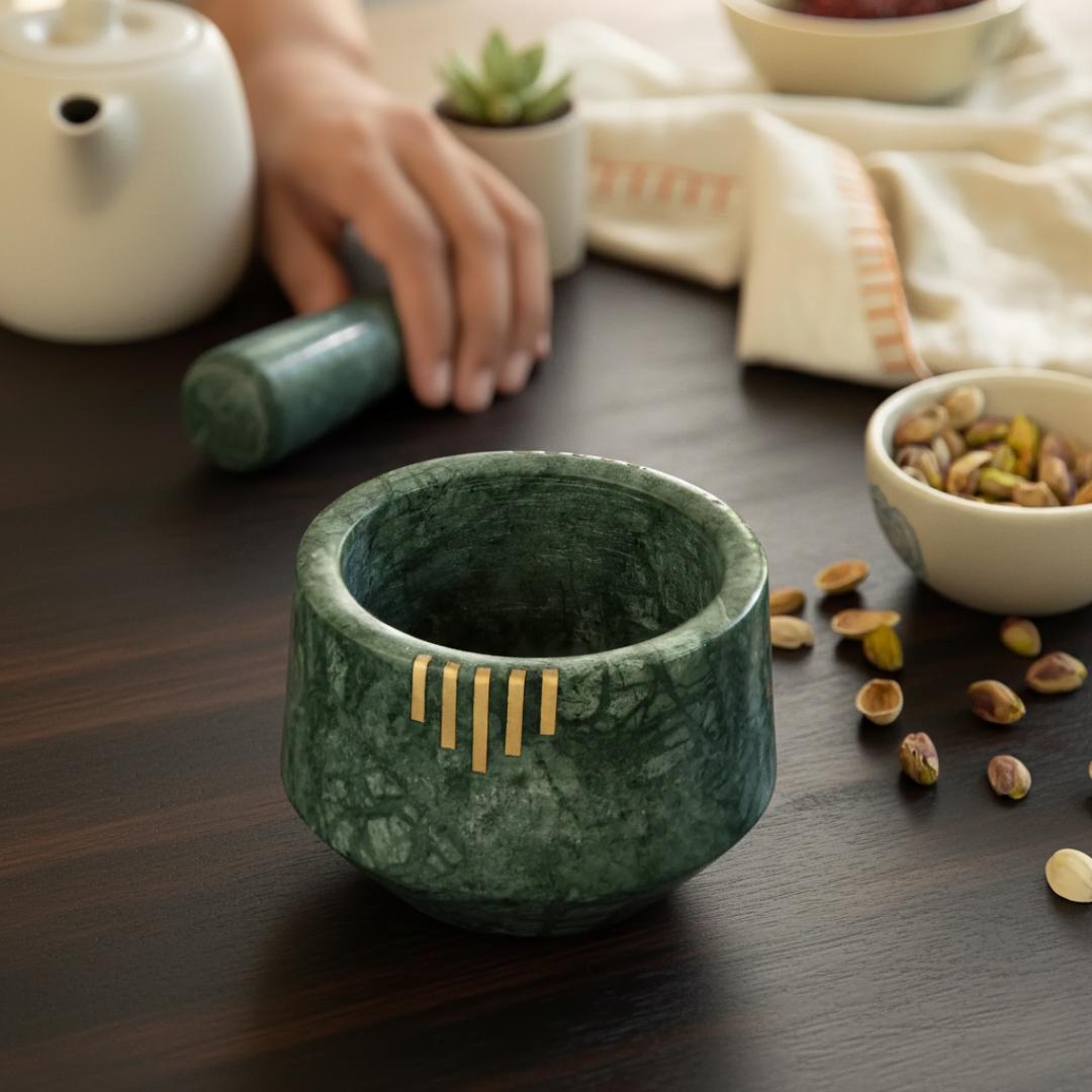 Bring everyday kitchen tasks to life with this handmade Green Marble Mortar & Pestle, a functional work of art that blends traditional cooking tools with refined design. Crafted from rich green marble with a beautiful brass inlay pattern, this mortar and pestle pairs durability with aesthetic appeal — perfect as both a culinary tool and a thoughtful gift for food lovers.