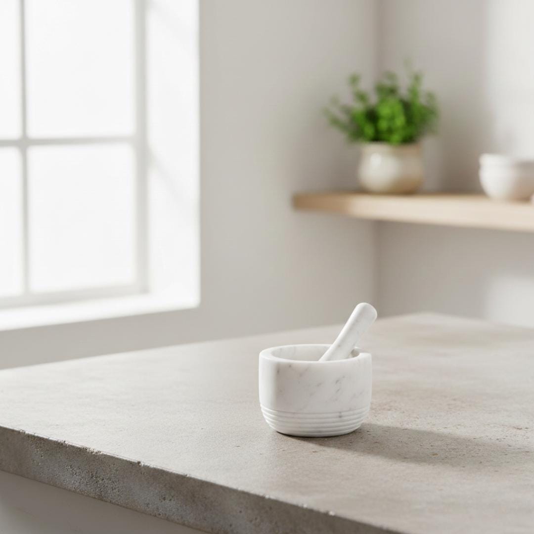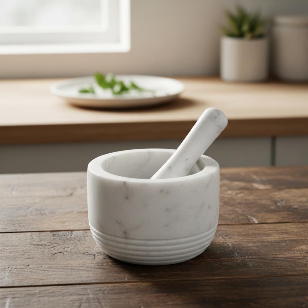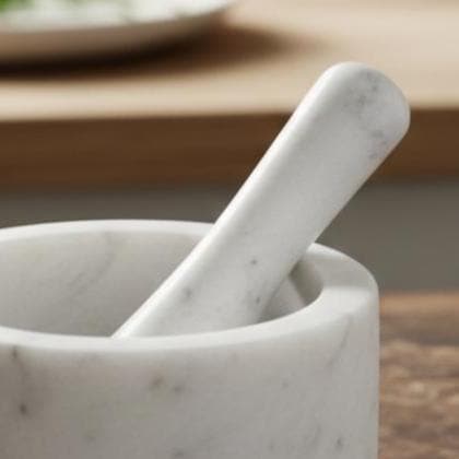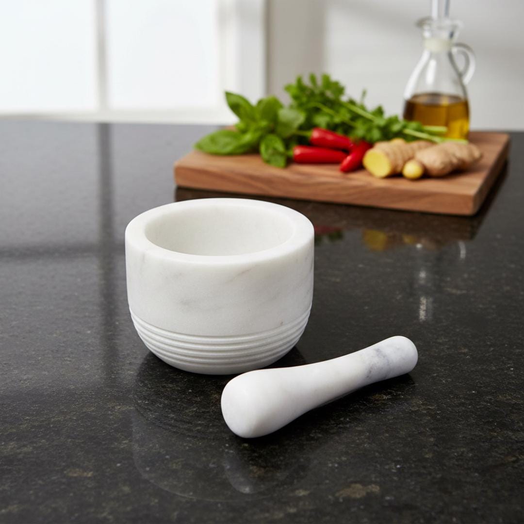 Elevate your kitchen with this timeless handcrafted white marble mortar & pestle, a classic culinary essential that combines function, beauty, and tradition. Carved from premium white marble, this set makes crushing and grinding herbs, spices, roots, and seeds effortless — unlocking richer flavors and authentic aromas in your cooking.