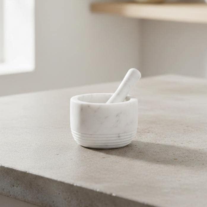 Each mortar and pestle is handmade, making every piece unique with natural veining and individual character. The solid marble construction gives it a satisfying weight and sturdy feel perfect for everyday kitchen use.
