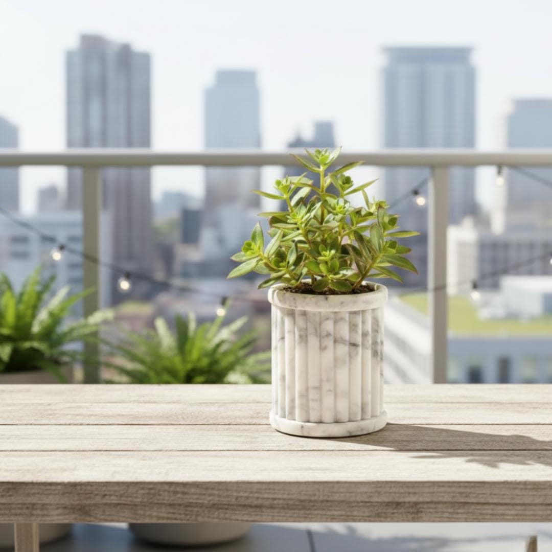 • Artisan Handcrafted Marble: Each planter is carefully crafted from premium marble, showcasing smooth edges and elegant curves that reflect meticulous workmanship. • Classic Sculpted Design: Inspired by traditional gadrooning, this planter adds a refined decorative statement to your living space. • Versatile Styling: Ideal as a plant holder for greenery or flowers, as well as a standalone sculptural décor piece on shelves, entryways, or patios. • Indoor & Outdoor Use: Works beautifully in living rooms, dining spaces, balconies, patios, or garden nooks — bringing nature and style together. • Perfect Gift: A thoughtful present for housewarmings, birthdays, weddings, plant lovers, or anyone who appreciates artisanal stone décor.
