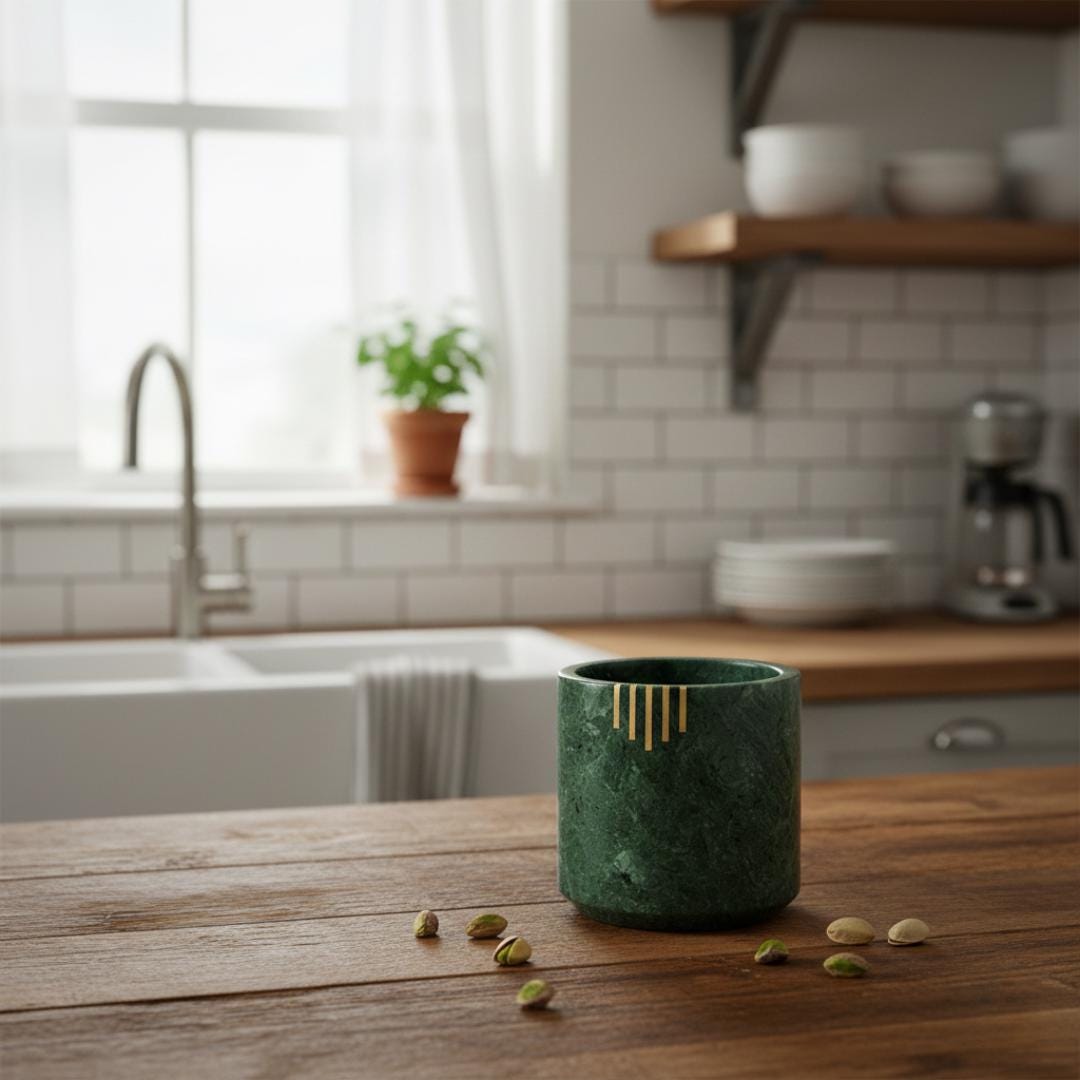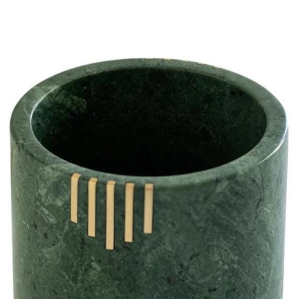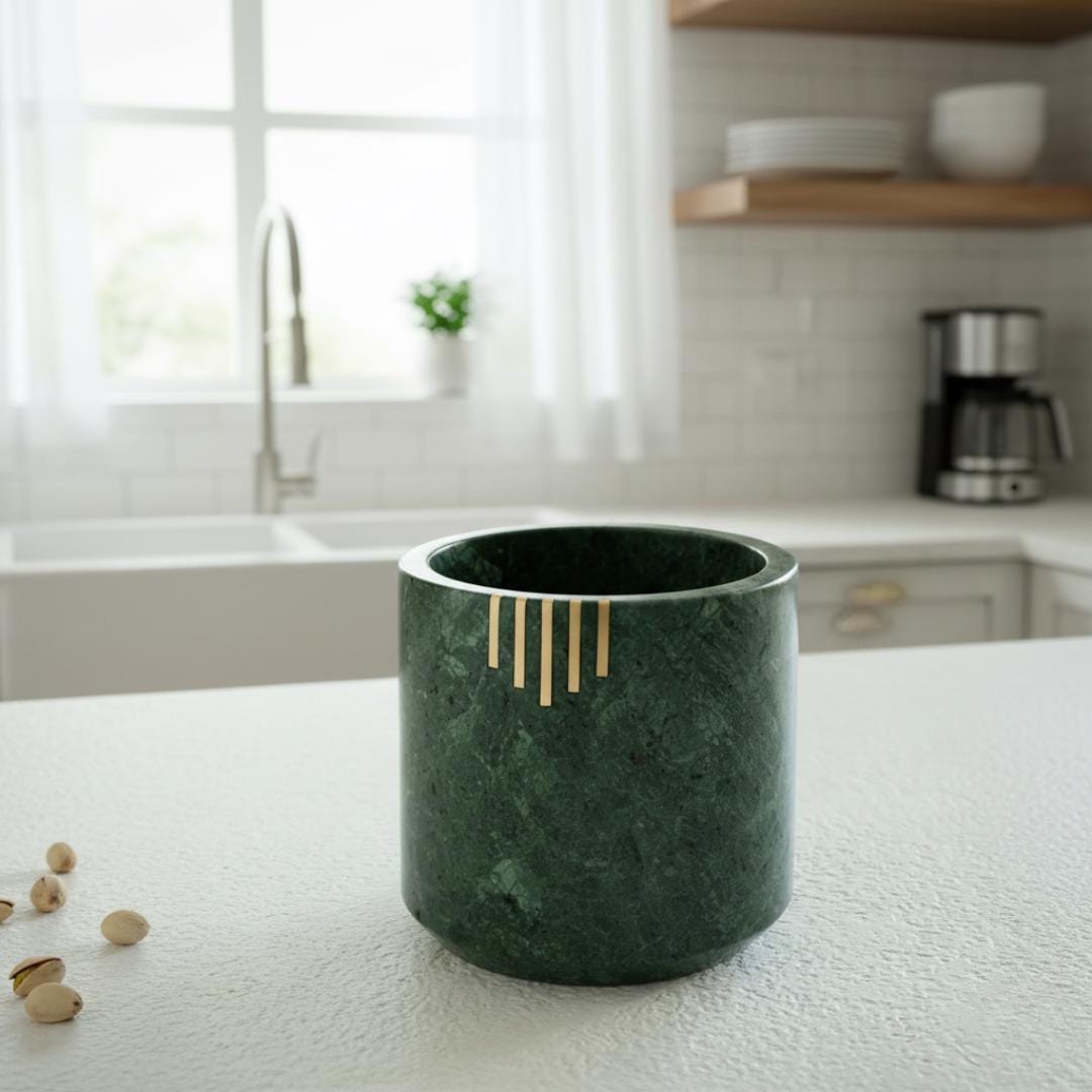 Add timeless elegance to every kitchen with this handcrafted Verde Marble Utensil Holder — a beautiful blend of function and art. Crafted from genuine green marble with striking natural veining and refined brass inlay accents, this premium utensil crock keeps your cooking tools organized while enhancing your countertop style.