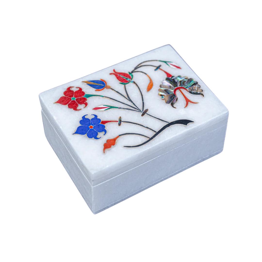 Elegant Floral Tapestry Marble Inlay Box – Handcrafted White Marble Keepsake & Jewelry Trinket Storage, Artisan Gift Decor