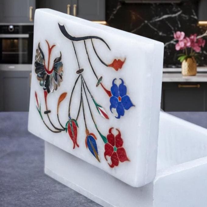Elevate your space with this stunning floral tapestry marble inlay box — a timeless fusion of elegant design and traditional artistry. This handcrafted white marble box features intricate floral inlay work, meticulously created by skilled Indian artisans using age-old techniques that celebrate heritage craftsmanship.