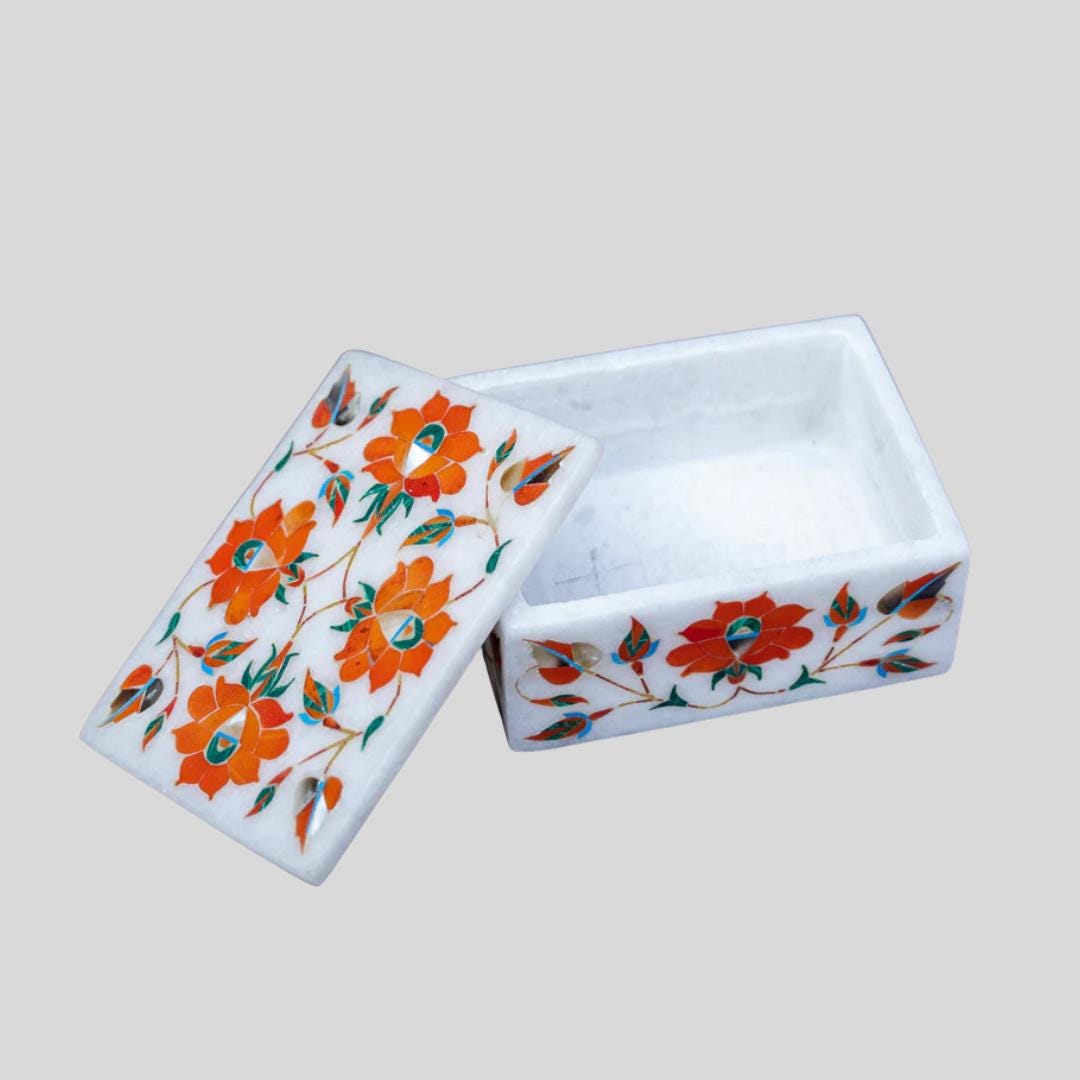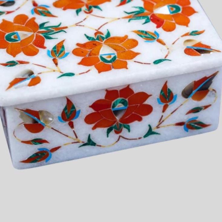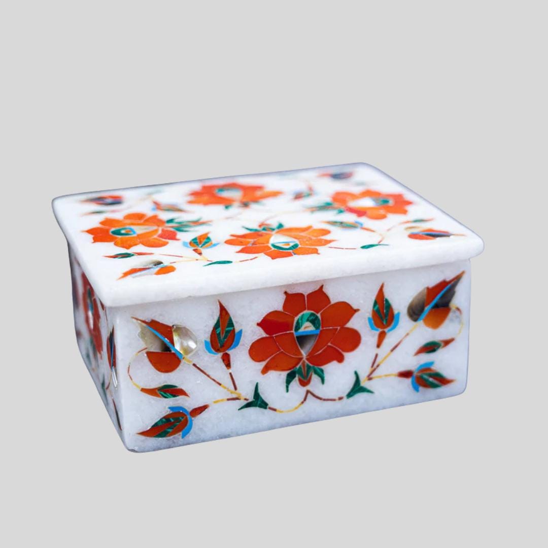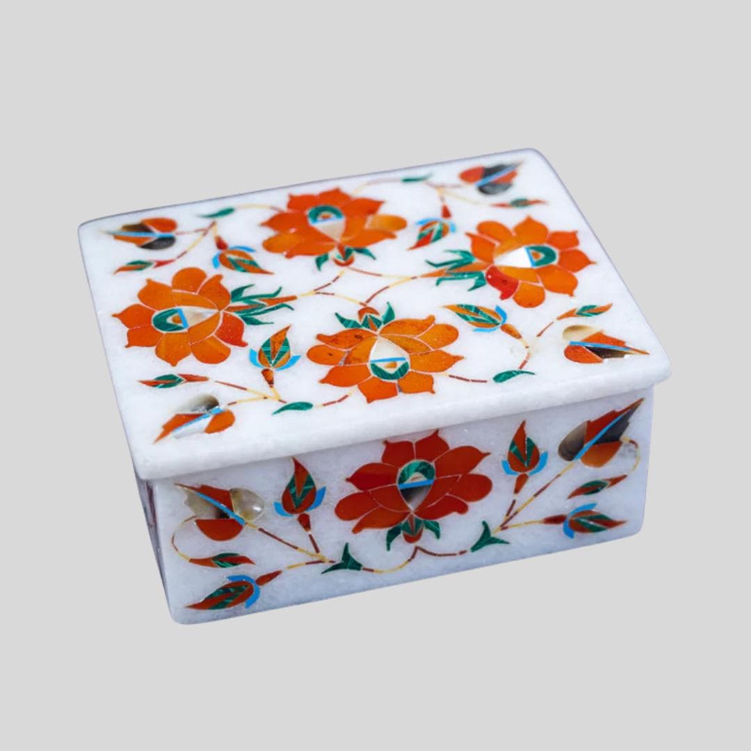 Each floral inlay box features vibrant floral motifs set against a pristine white marble base, polished for a high-end finish. Its compact rectangular shape (approx. 4″ × 3″ × 1.5″) makes it perfect for display and everyday use.