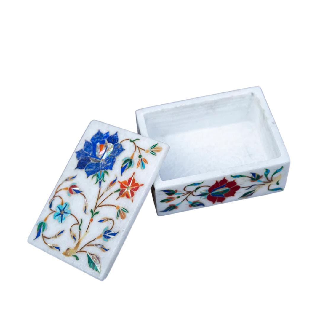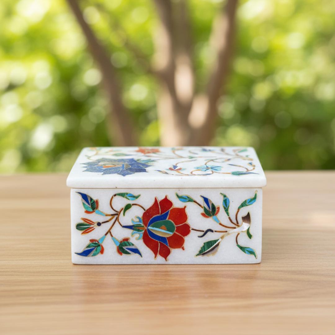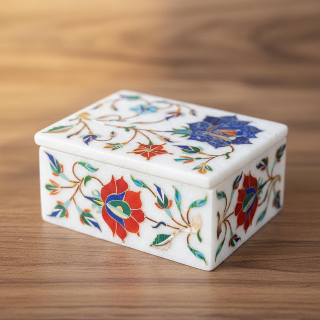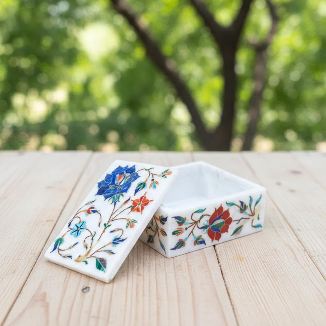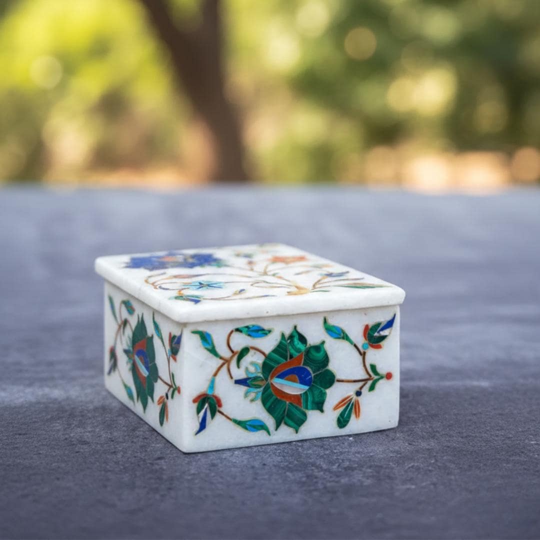 Every marble box is lovingly made by skilled craftsmen in Uttar Pradesh using traditional techniques passed down through generations. Tiny pieces of colored stone are precisely cut and embedded into the marble surface to form vibrant floral motifs — each box reflecting natural stone variations and unique artistic expression.