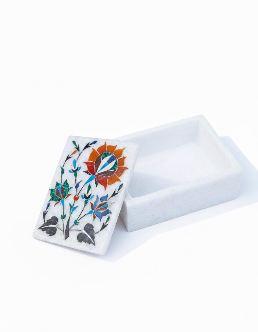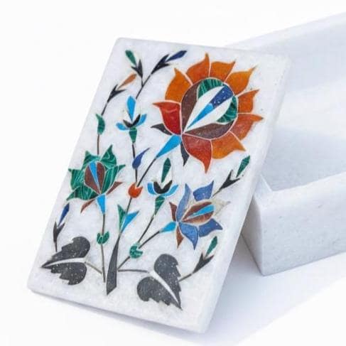 Add a touch of timeless elegance to your home with this Floral Tapestry Marble Inlay Box — a handcrafted masterpiece that celebrates traditional Indian marble artistry. This beautiful box is made from genuine white marble and features vibrant floral inlay motifs, created using the centuries-old Pietra Dura technique practiced by master artisans in Uttar Pradesh, India.