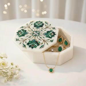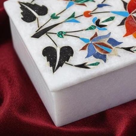 🌸 Artisan Craftsmanship Each box is meticulously crafted with polished marble and delicately inlaid floral patterns that make it both a functional storage piece and an eye-catching decorative accent. Originating in Indian marble heritage and inspired by historic Mughal art, this piece brings classic artisanal charm into modern interiors.