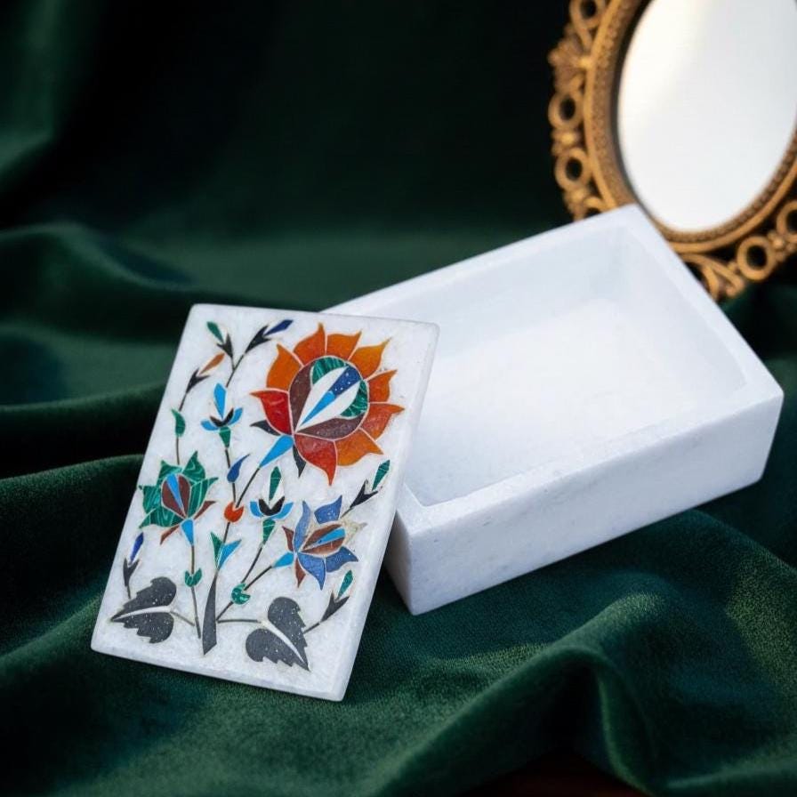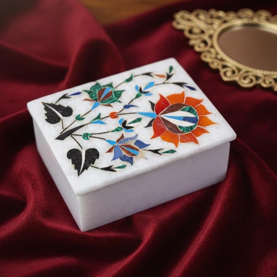 Floral Tapestry Marble Inlay Box – Handcrafted White Marble Jewelry & Keepsake Box, Indian Artisan Home Decor Gift
