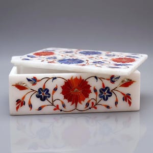 📏 Beautiful Details: • Material: White marble • Craft: Marble Inlay (Pietra Dura) • Origin: Uttar Pradesh, India • Measurements: Approx. 4″ L × 3″ W × 1.5″ H