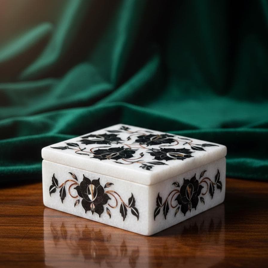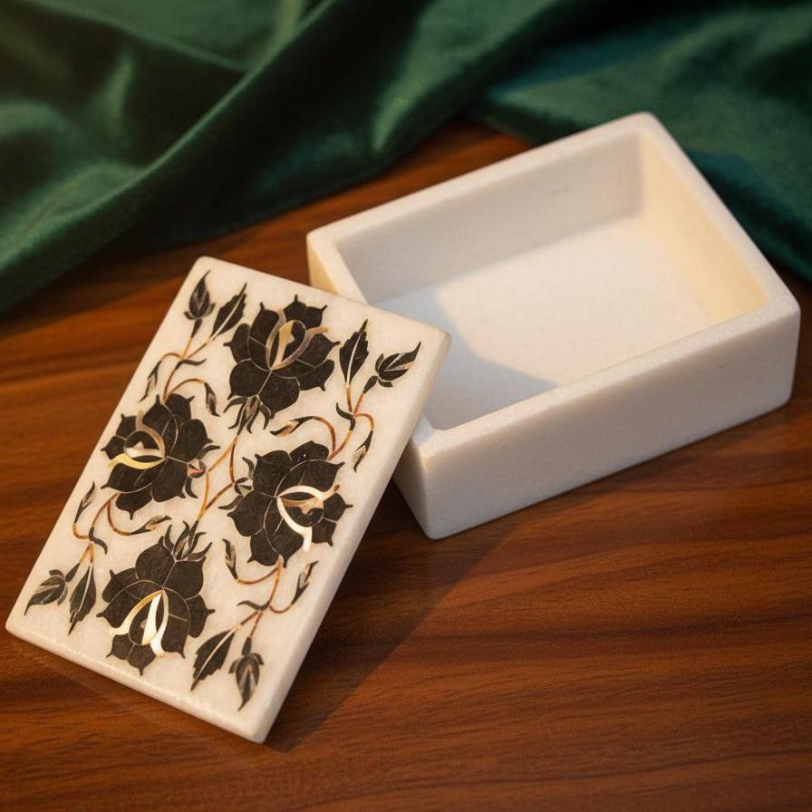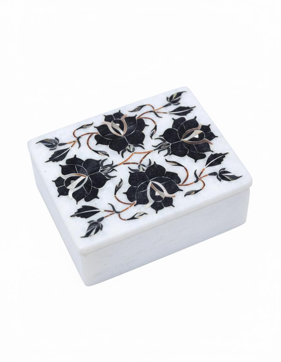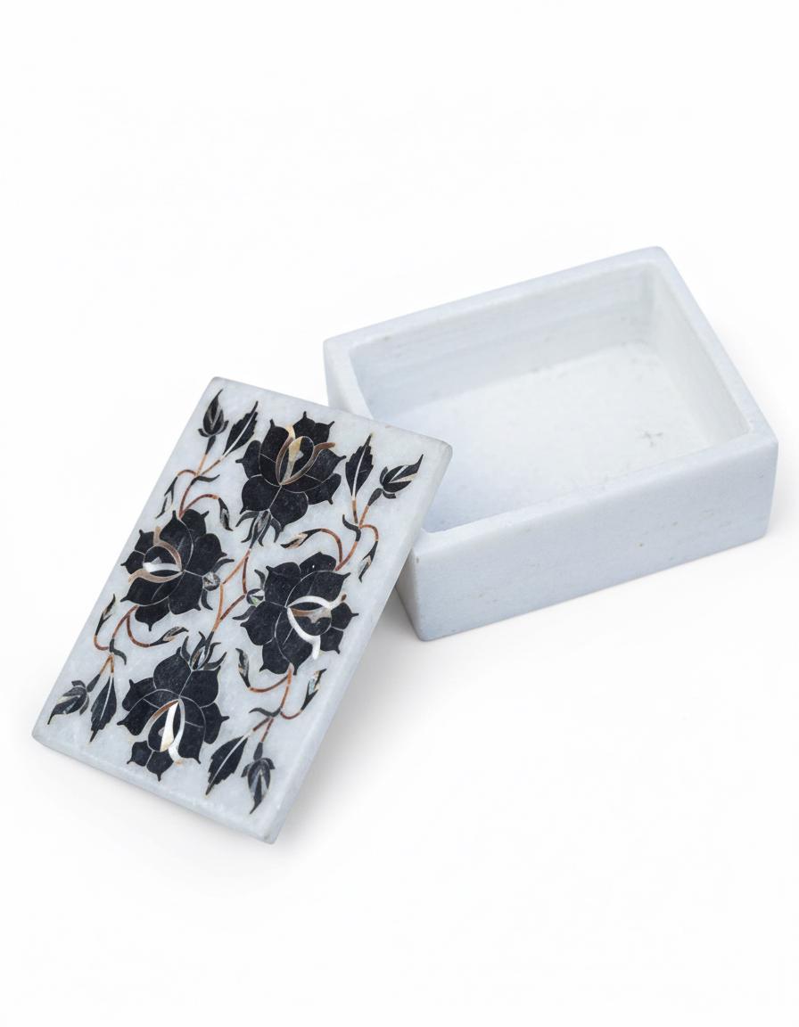 Each Floral Tapestry Marble Inlay Box is handcrafted in Uttar Pradesh, India, a region celebrated for marble artistry. Artisans carefully engrave and insert precise marble pieces to form intricate floral patterns, reflecting techniques similar to pietra dura—a decorative inlay method with historic significance.