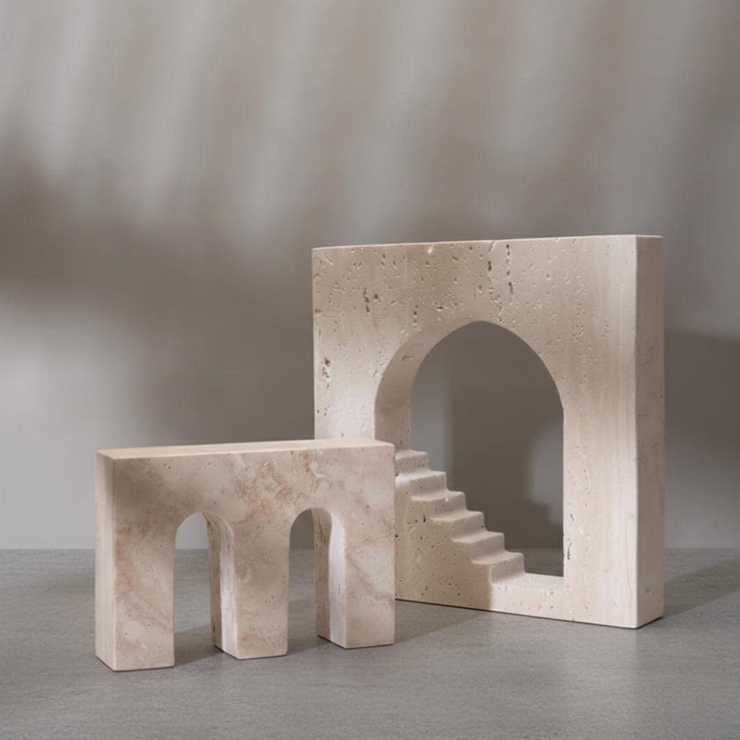 🌿 Product Features • Material: Premium travertine stone with unique natural texture and earthy tones — every piece has its own character. • Design: Inspired by Italian craftsmanship, the modern arch and stairway form brings architectural elegance to contemporary and minimalist interiors. • Style: Abstract architectural sculpture — perfect as a décor accent or sculptural focal point. • Handmade: Artisanal craftsmanship with durable finish — small variations make each sculpture one‑of‑a‑kind. • Size: Approx. 10″ Height × 10″ Width × 2″ Depth — ideal for shelves, mantels, and side tables.