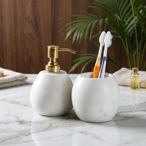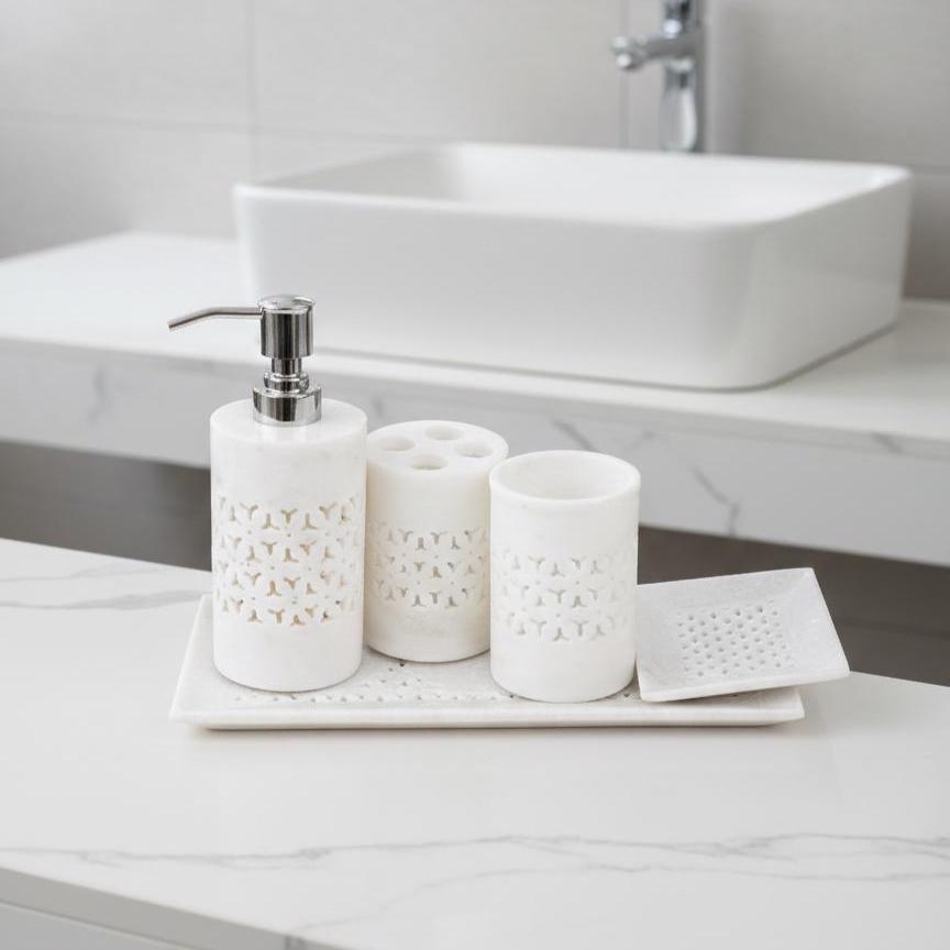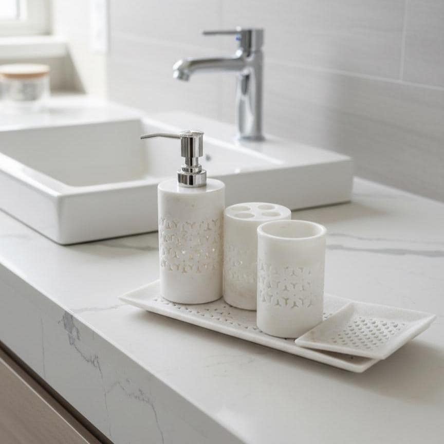 Elevate your bathroom with timeless elegance and artisan craftsmanship with this handcrafted 5‑piece white marble bathroom accessories set. Made from premium natural marble, this set blends practical functionality with luxurious decor to enhance any bathroom vanity or countertop.