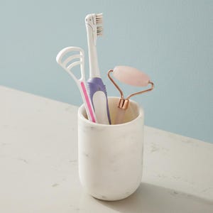 Size: Marble Tray: 29 × 14 × 1 cm (L×W×H) Lotion Holder: Ø 7 × 19 cm (D×H) Soap Dish: 13 × 9 × 1 cm (L×W×H) Toothbrush Holder: Ø 7 × 10 cm (D×H) Tumbler: Ø 7 × 10 cm (D×H)