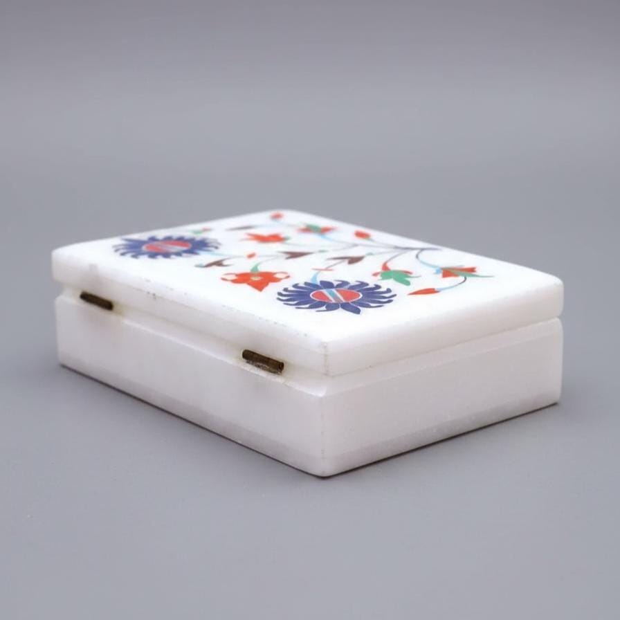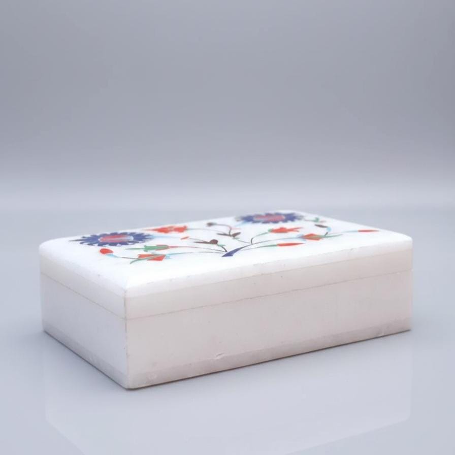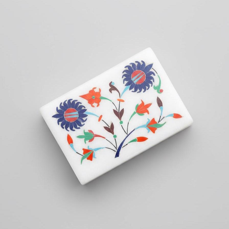 📏 Product Details: • Material: Natural Marble with traditional inlay work • Design: White base with red and blue floral motifs • Dimensions: Approx. 6″ Length × 4″ Width × 1.7″ Height • Care: Wipe gently with a soft dry cloth to preserve the polished surface