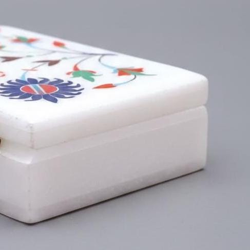 🌿 Artisan Craftsmanship: This marble box is handcrafted by skilled artisans in Uttar Pradesh, India, using the age-old marble inlay (Pietra Dura) technique, where delicate floral patterns in red and blue are precisely inlaid into pure white marble. This centuries-old craft creates truly unique pieces of art with subtle variations in each design.