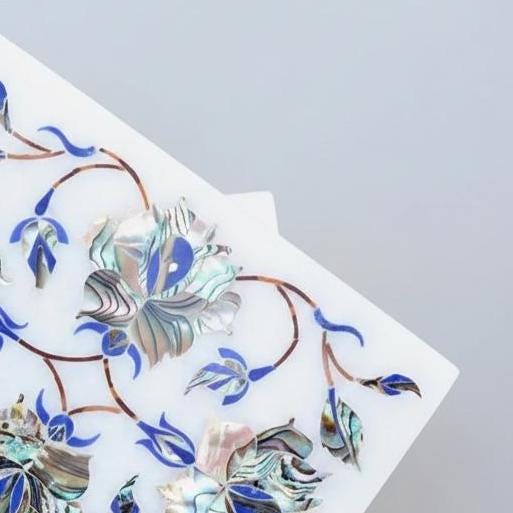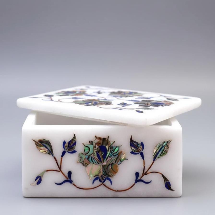 • Material: Natural marble with blue floral inlay work • Craft: Traditional Indian marble inlay (Pietra Dura) • Colour: White base with blue floral accents • Dimensions: Approx. 4″ L × 3″ W × 2″ H — compact & versatile • Weight: ~600 g — sturdy and balanced • Origin: Handcrafted in Agra, Uttar Pradesh, India • Care: Wipe gently with a soft, dry cloth to maintain the finish