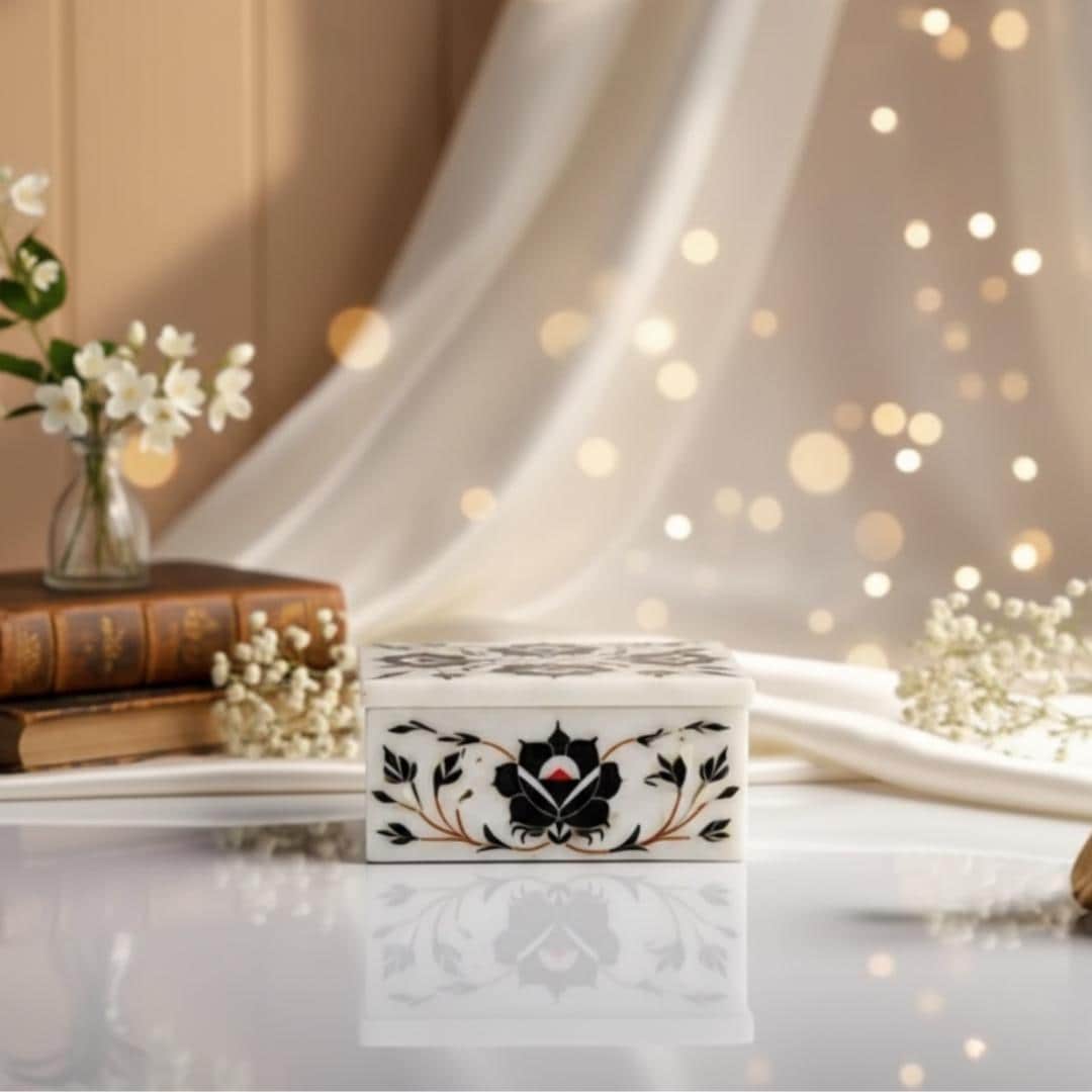 🌸 Handmade Marble Keepsake Box This elegant jewelry box is meticulously carved from 100% natural marble and adorned with beautiful floral motifs, inspired by the iconic Taj Mahal inlay art tradition. No two pieces are the same — every box features unique stone patterns, rich color contrasts, and hand-set semi-precious inlays.