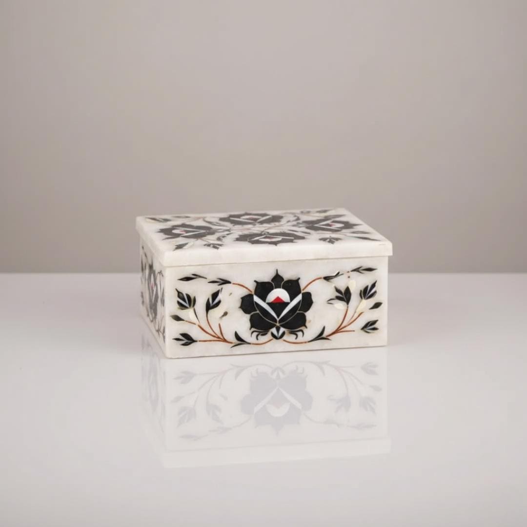 Enhance your home décor and treasure your most cherished pieces with this Artisanal Marble Jewelry Box, handcrafted using centuries-old pietra dura stone inlay techniques passed down through generations of Indian artisans.