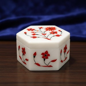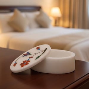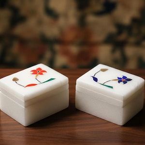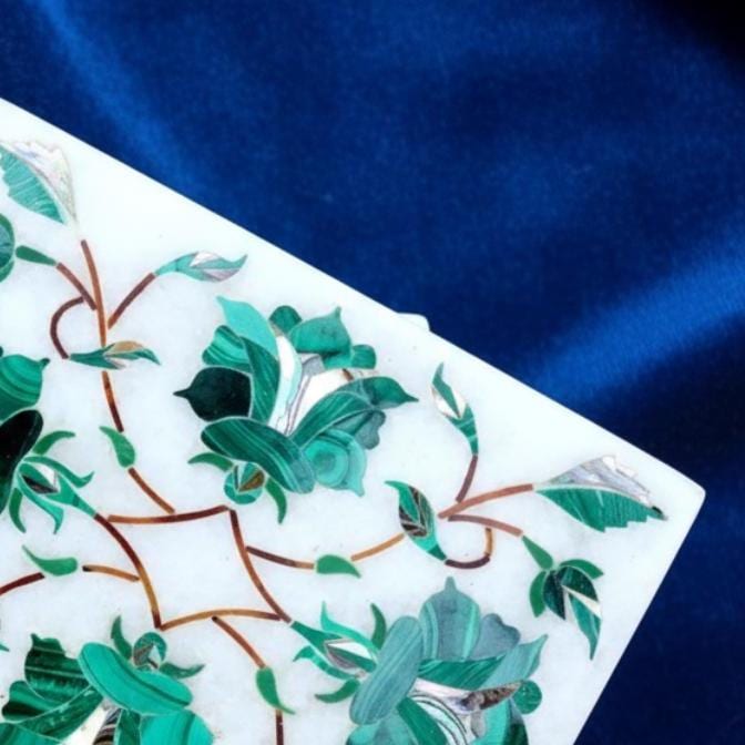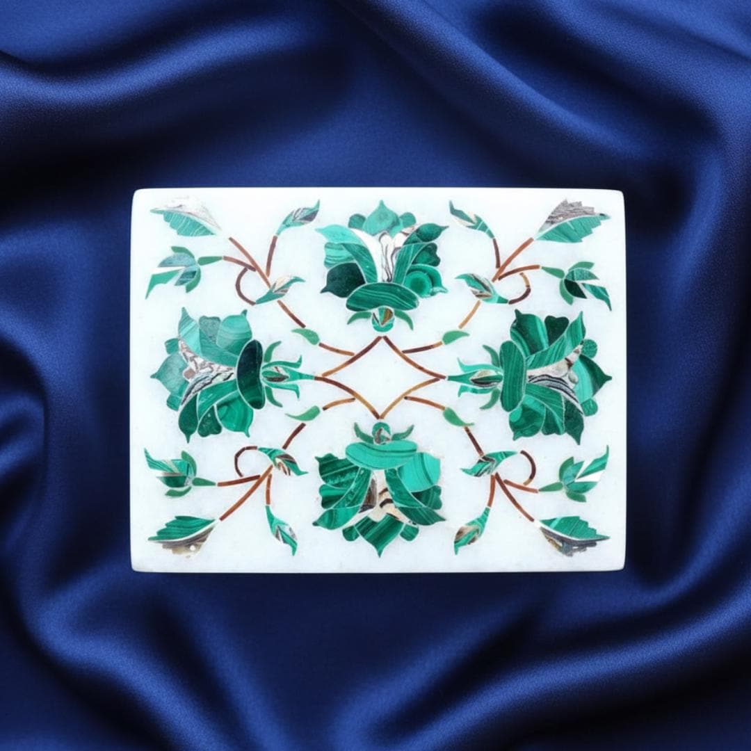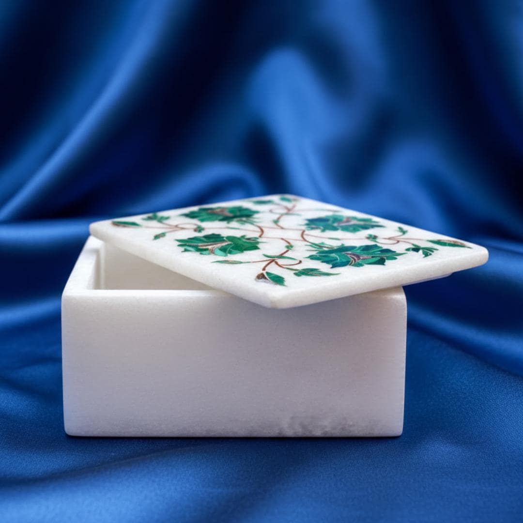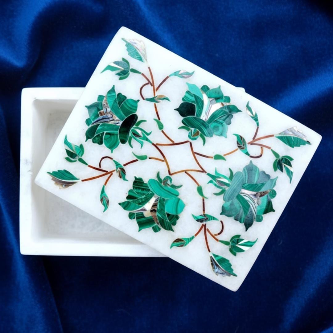 🌿 Artisan Craftsmanship Each box is meticulously handcrafted by skilled artisans in Uttar Pradesh, India using the traditional marble inlay technique (pietra dura) — a craft inspired by Mughal art and motifs like those seen in historic masterpieces.