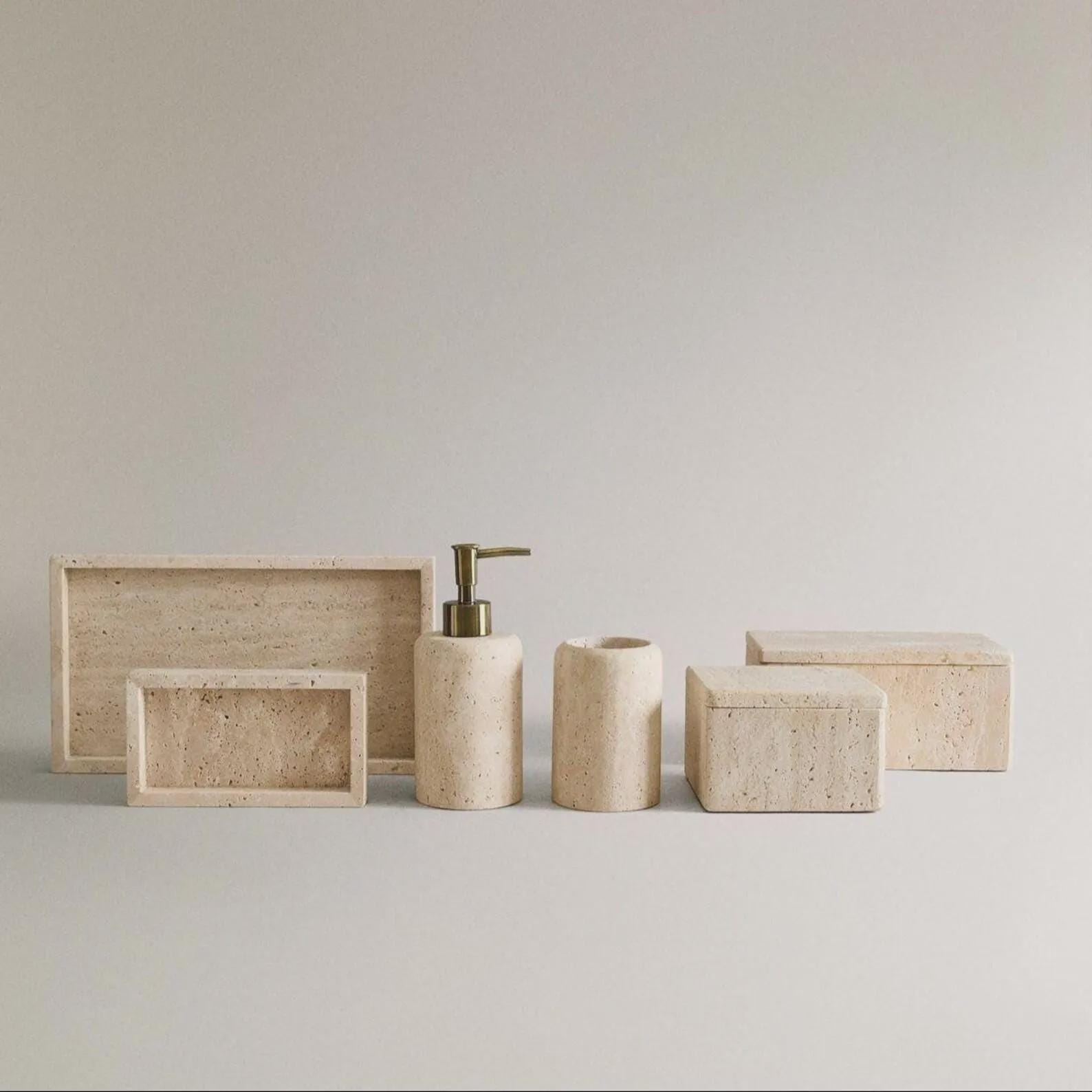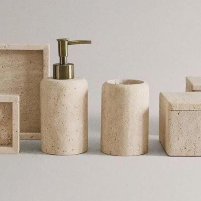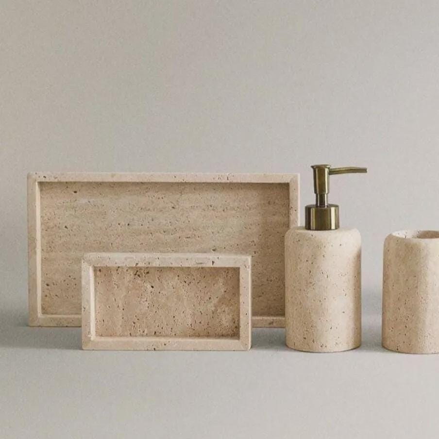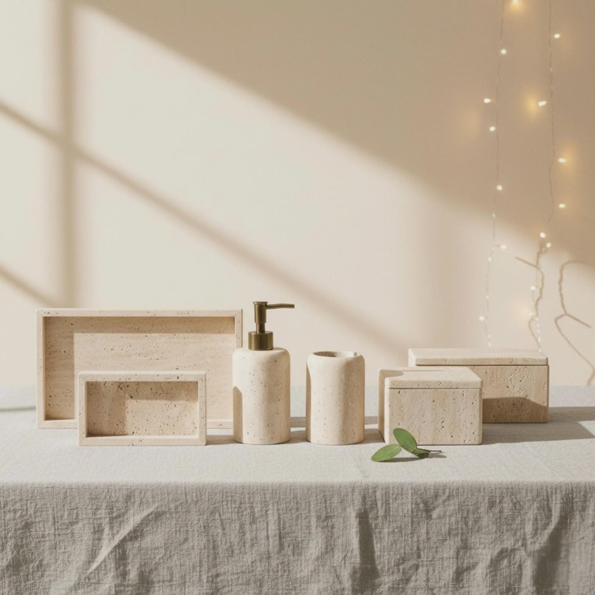 Handmade Travertine Bathroom Decor – Minimalist Vanity Set with Soap Dispenser & Storage Box