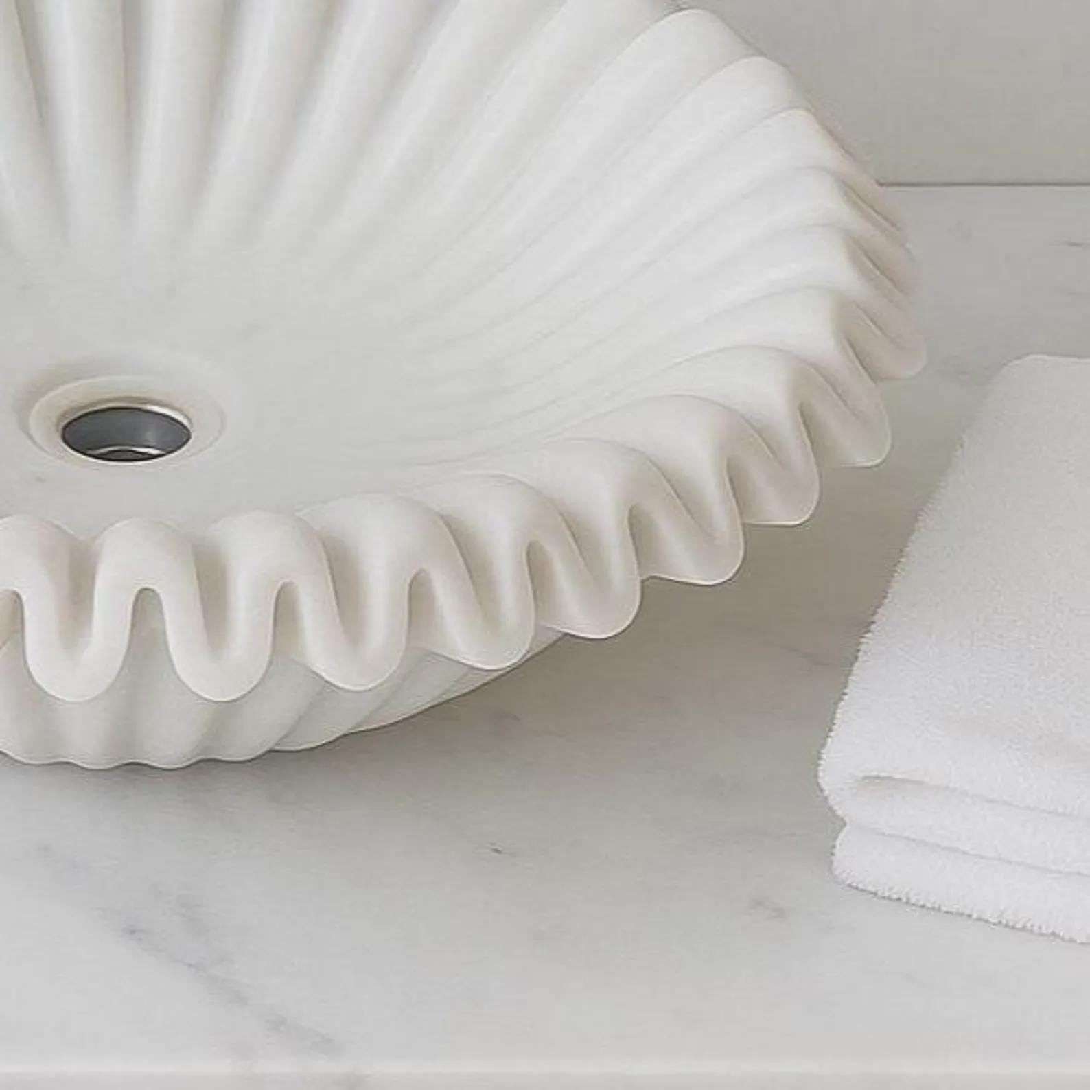 Elevate your bathroom with the timeless beauty of this Handcrafted White Marble Ruffle Sink — a true fusion of art and functionality. Expertly sculpted from 100% natural white marble, this designer basin features a stunning ruffled edge design that adds a touch of sculptural elegance to any modern or luxury bathroom interior.