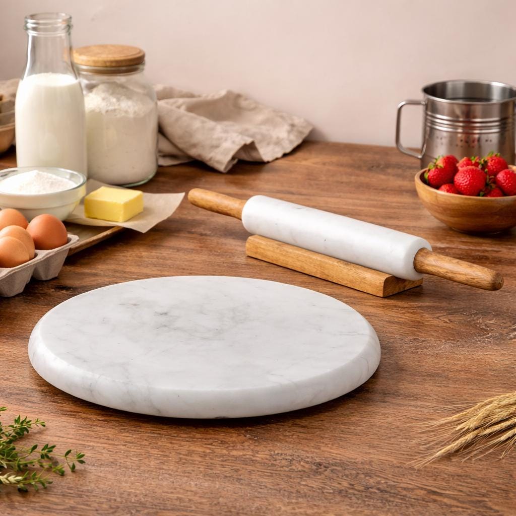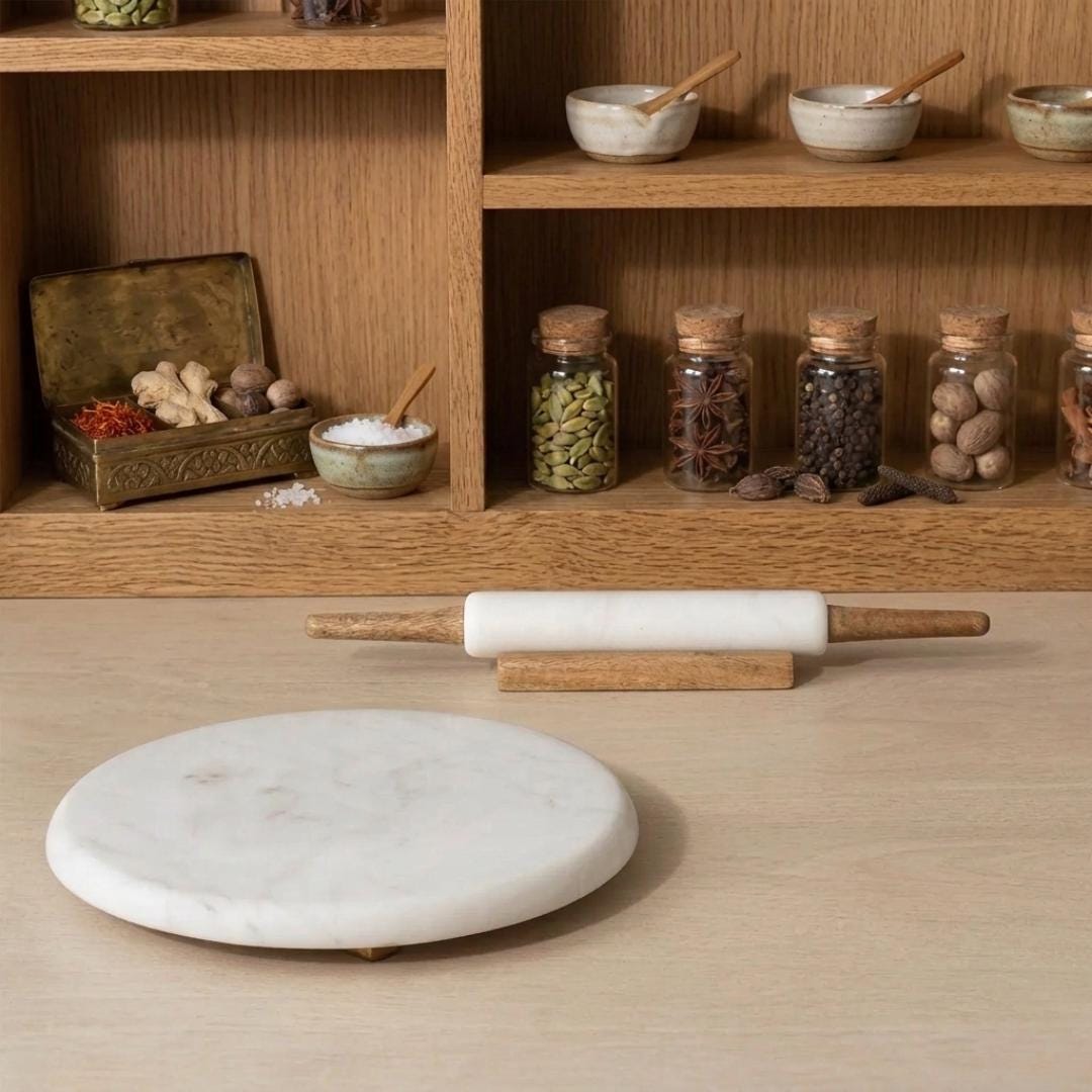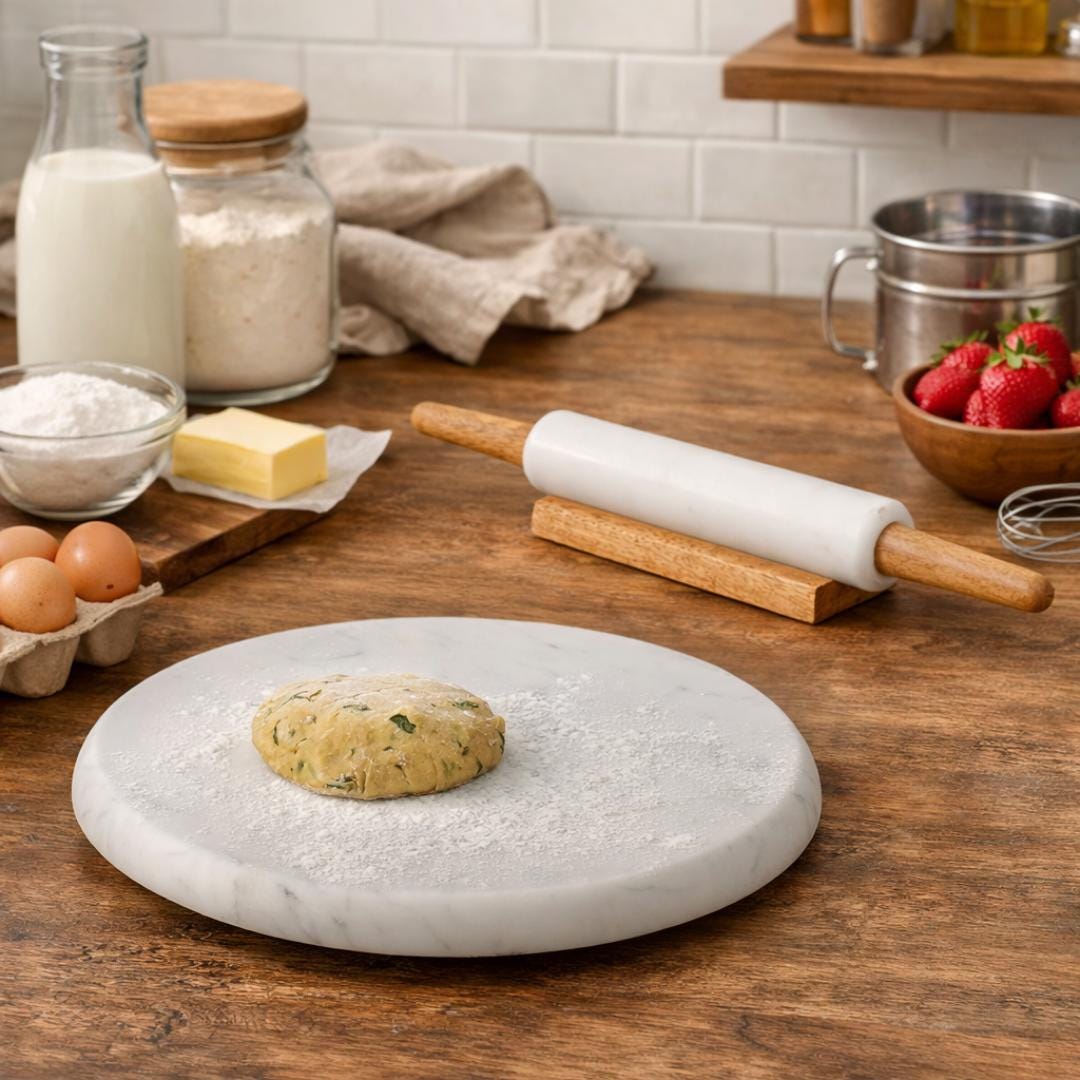 The solid marble chakla provides a smooth and naturally cool surface, making it ideal for rolling soft dough evenly. The ergonomic rolling pin allows comfortable grip and control, helping you create perfectly shaped rotis, chapatis, tortillas, parathas, and pastries.