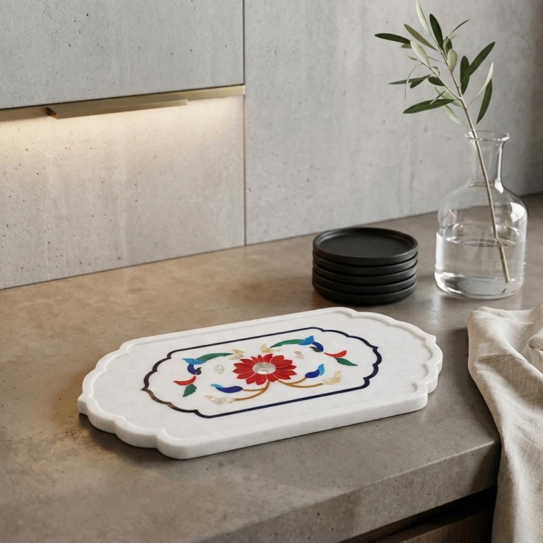 Each tray is carefully carved and polished by skilled artisans in India, highlighting the natural marble veining and unique stone patterns that make every piece one of a kind. The smooth polished finish gives the tray a premium look while ensuring durability and long-lasting use.