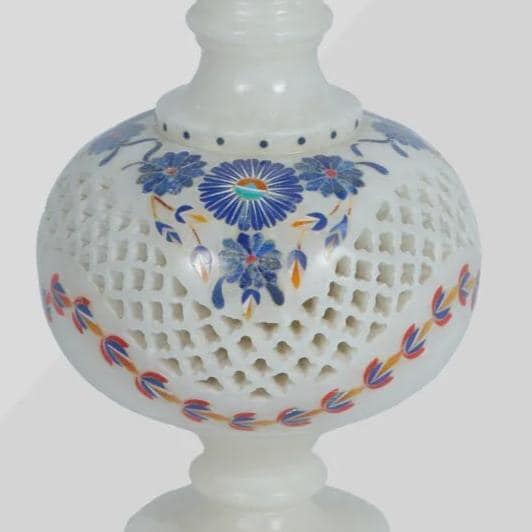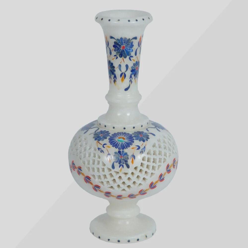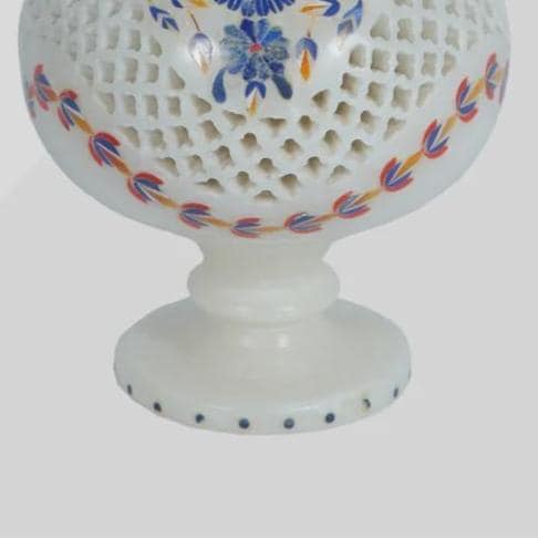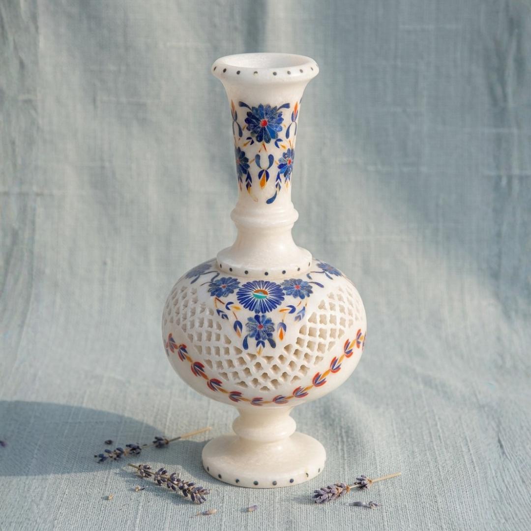 Every marble vase is meticulously handcrafted by skilled artisans from Agra, a region famous for its marble inlay artistry. The use of natural marble and hand-cut gemstones means each piece carries slight variations in color and texture, making it truly unique.