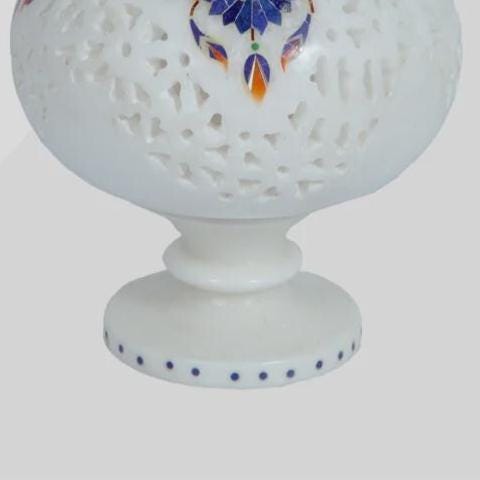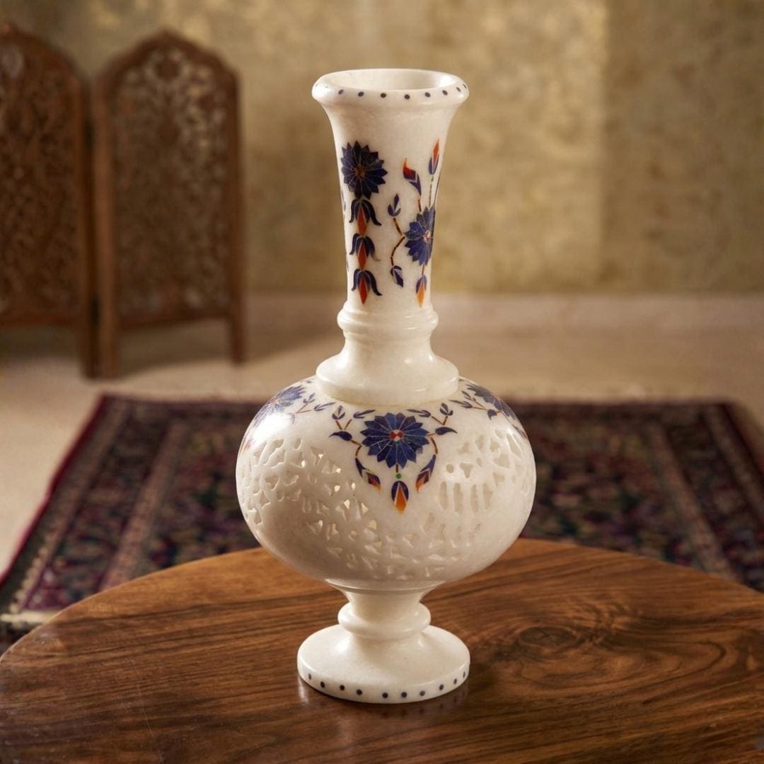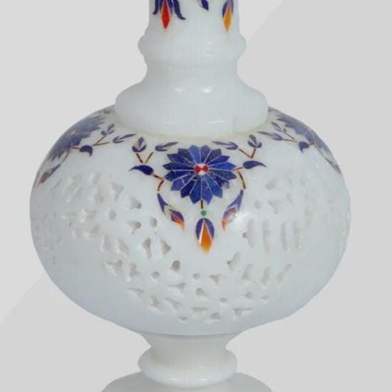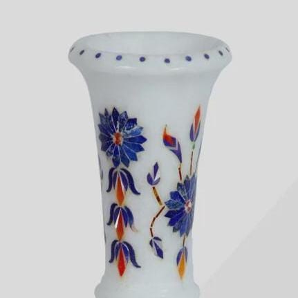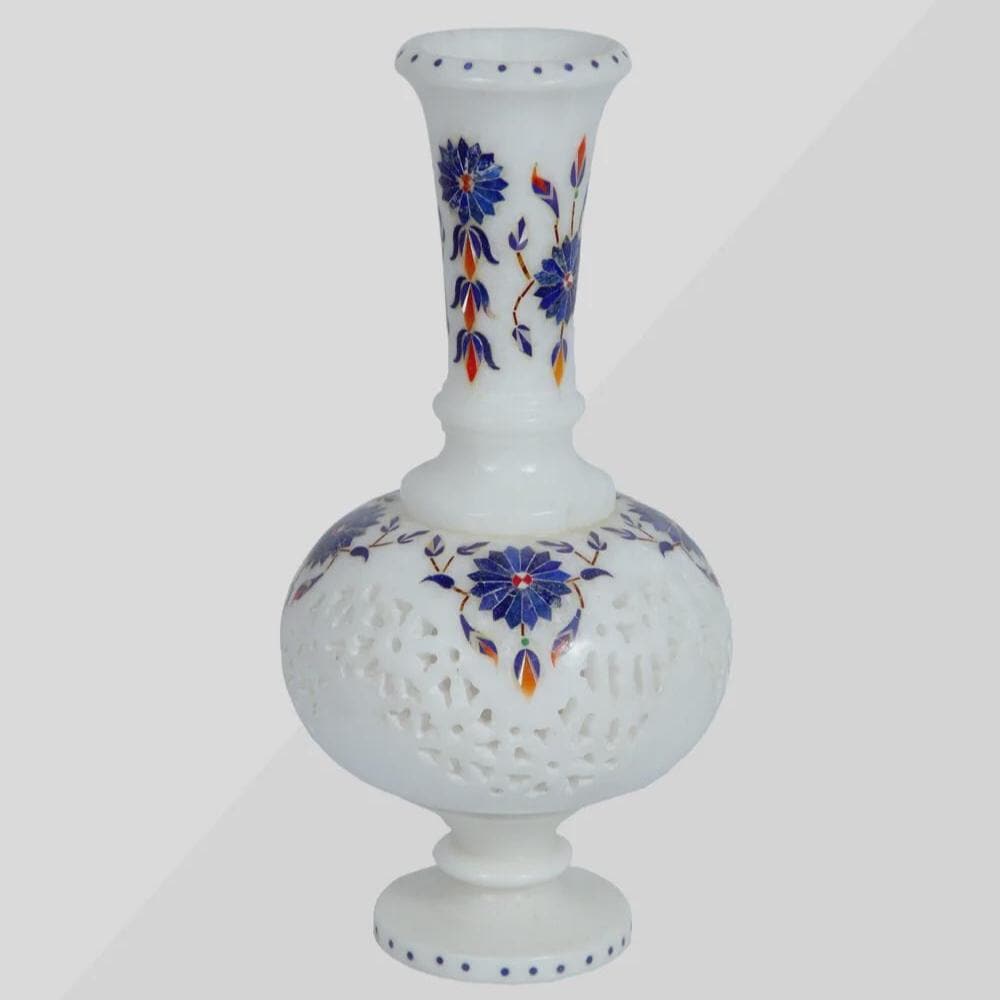 Enhance your interior with this beautiful handmade white marble inlay flower vase, a timeless piece of traditional stone craftsmanship. Carefully crafted from premium white marble, this decorative vase features intricate floral inlay work created with semi-precious stones such as lapis lazuli, mother of pearl, and carnelian.