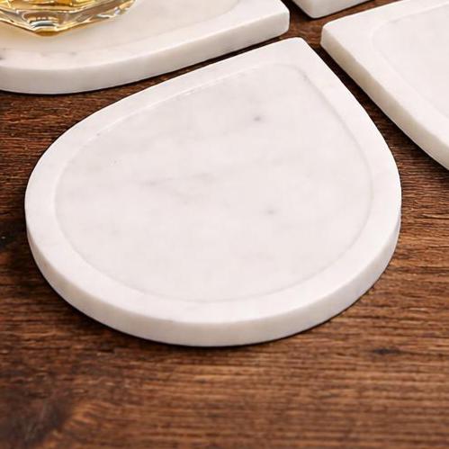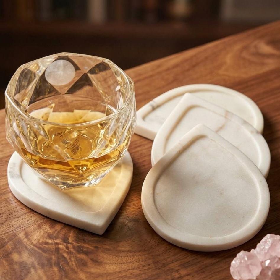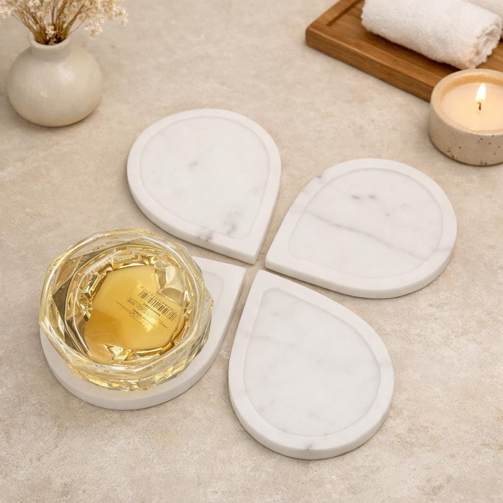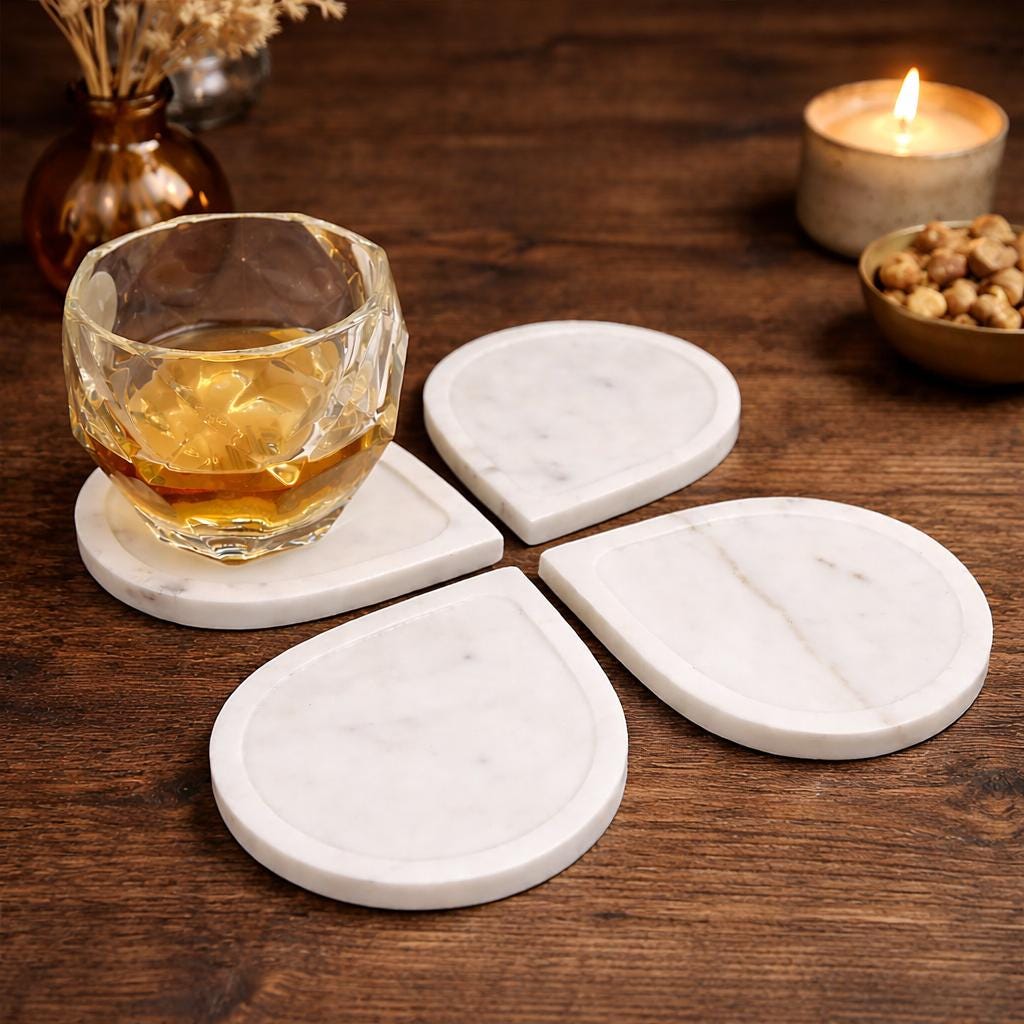 • Material: Natural White Marble • Design: Elegant Petal Shape • Set Includes: 4 Marble Coasters • Finish: Smooth polished stone • Craftsmanship: Handmade by skilled artisans • Use: Drink coasters, table protection, decorative accessory