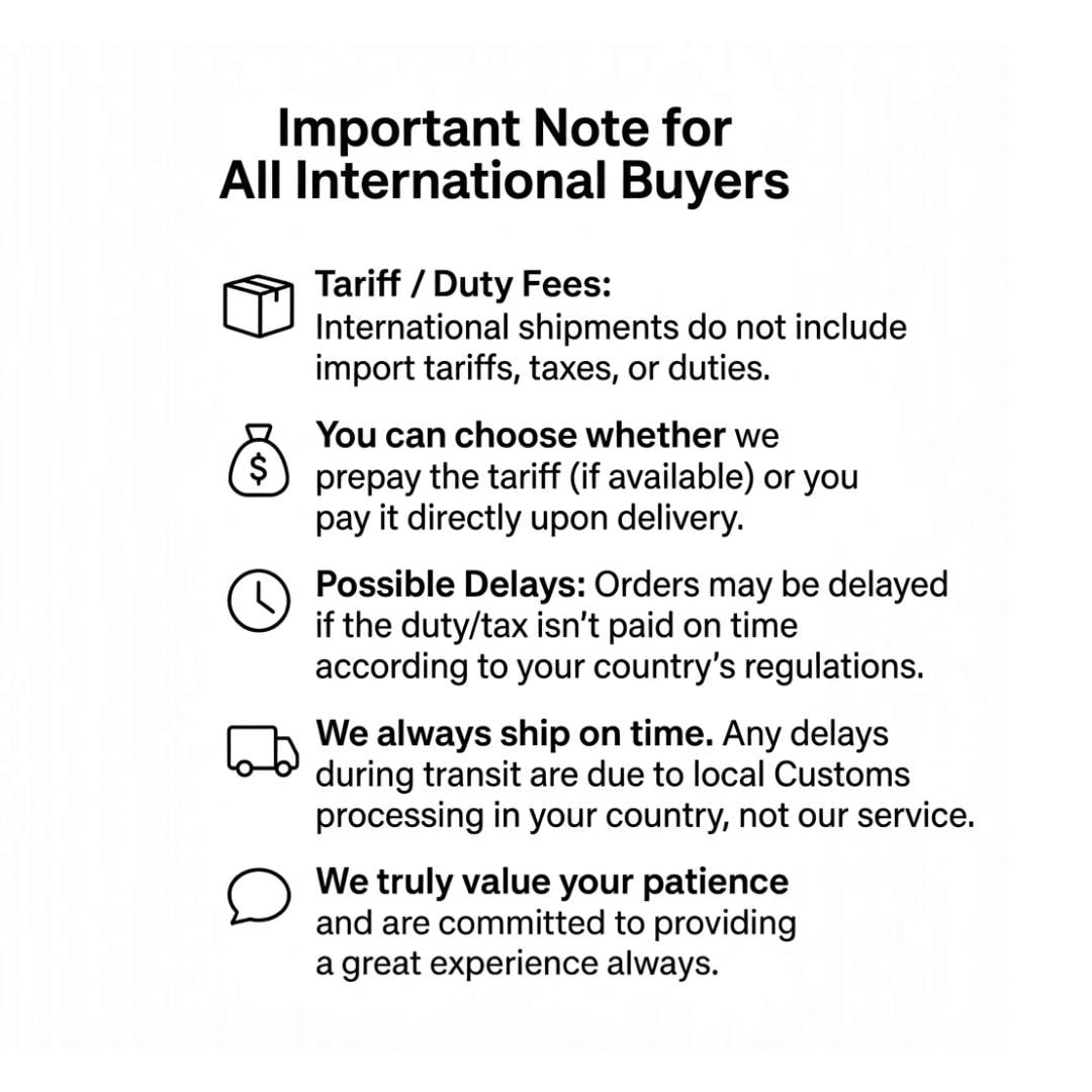 Custom Duty: Buyer pays any applicable import taxes/duties