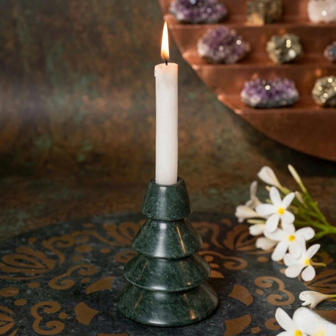 🌿 Key Features • Premium Natural Green Marble: Beautiful and durable stone with deep green hues, creating a timeless and refined effect in any room. • Elegant Candle Stand: Perfect for holding candles — from pillar candles to votives — enhancing ambiance and décor with warm glow. • Versatile Home Accent: Ideal for living rooms, dining tables, bedside tables, entryways, or meditation spaces. • Unique Gift Idea: A thoughtful and stylish present for housewarmings, weddings, birthdays, or holidays. • Minimalist & Modern Design: Sleek stone finish that complements both contemporary and classic interiors.