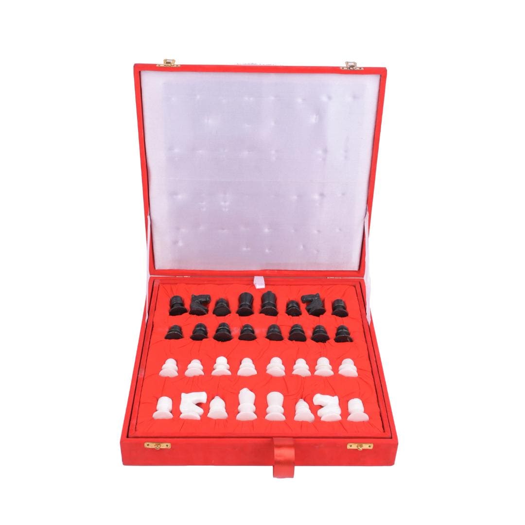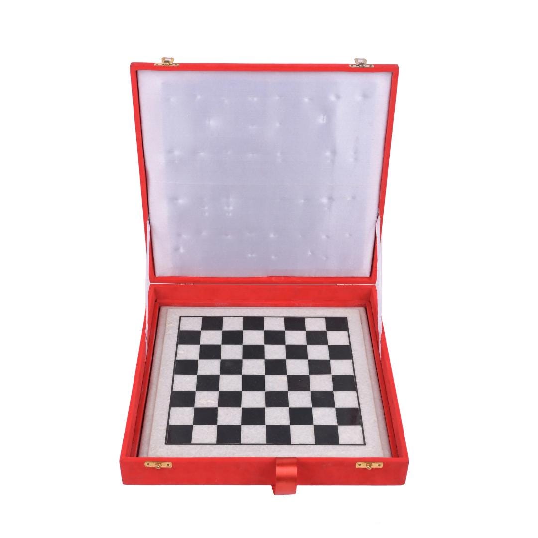 • Material: Natural Marble Stone • Board Size: 12 inches (30 × 30 cm) • Height: 5 cm • Weight: Approx. 5 kg • Color: Black and White Marble • Includes: Marble chess board + stone chess pieces • Packaging: Premium velvet gift box • Handmade in Agra, India • Care: Clean with a soft dry cloth