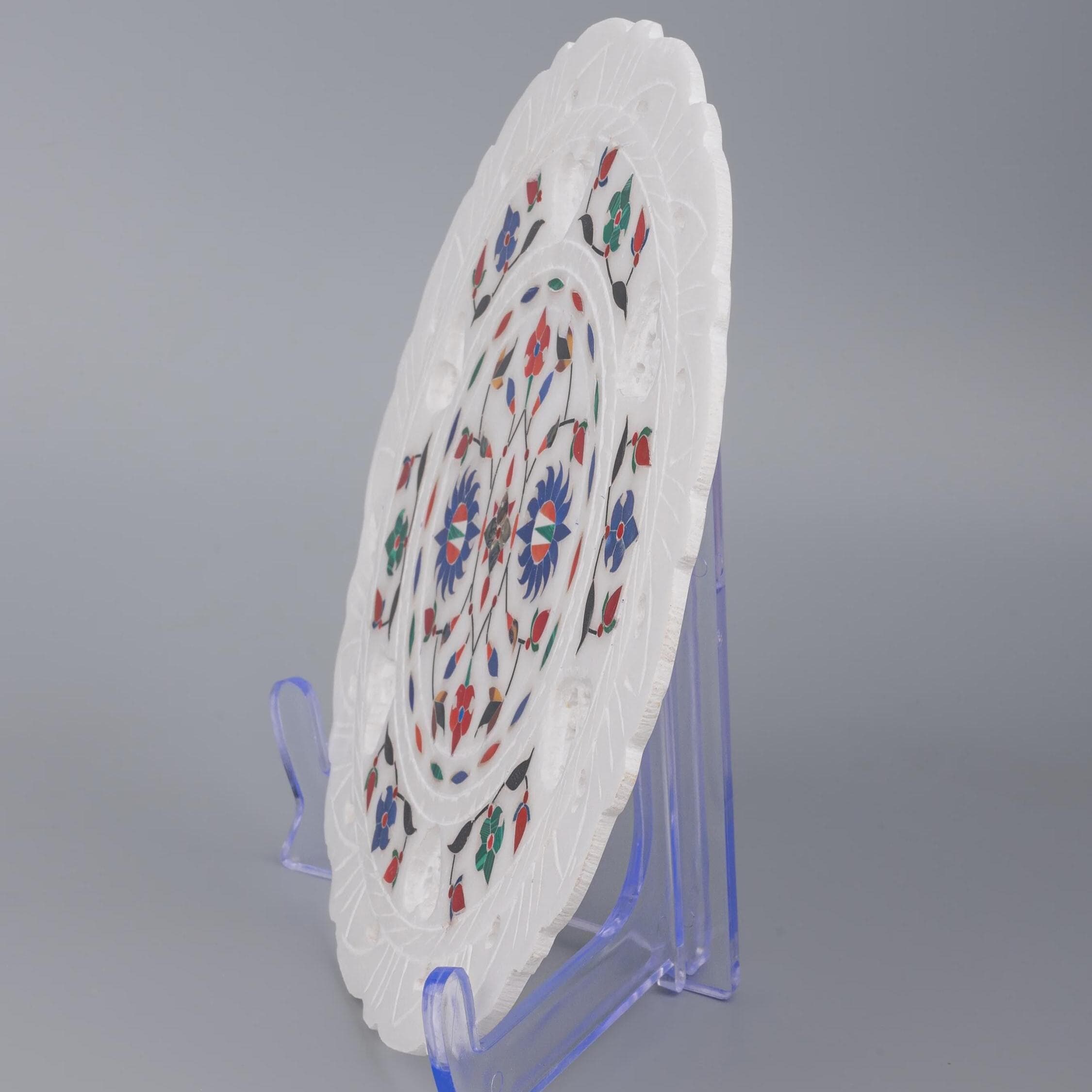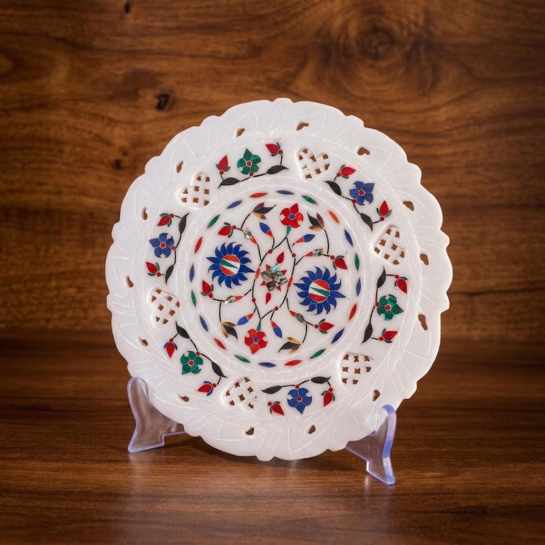 This marble decor plate is created using the traditional pietra dura inlay technique, where semi-precious stones are carefully inserted into carved marble surfaces to create intricate patterns. This craft has been practiced in India for centuries and remains one of the most admired forms of marble artistry.
